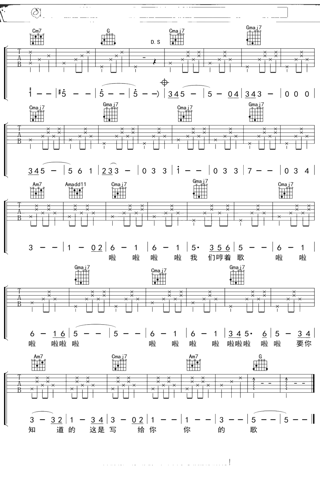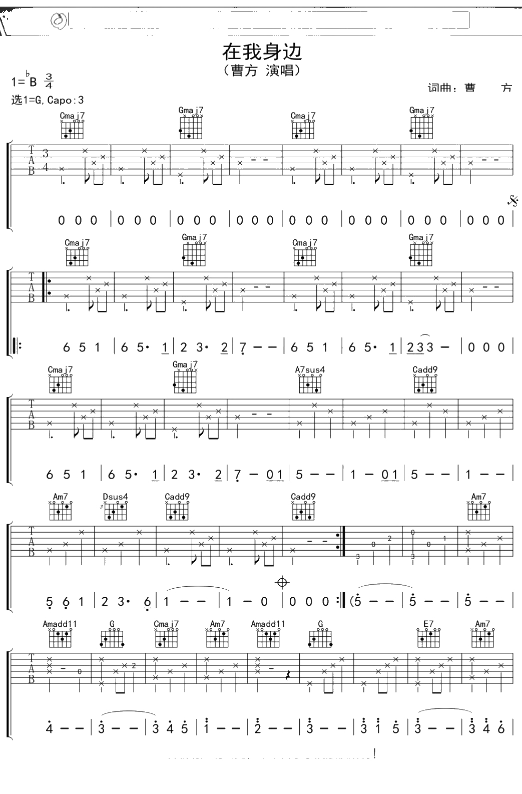 曹方《在我身边》吉他谱 弹唱六线谱