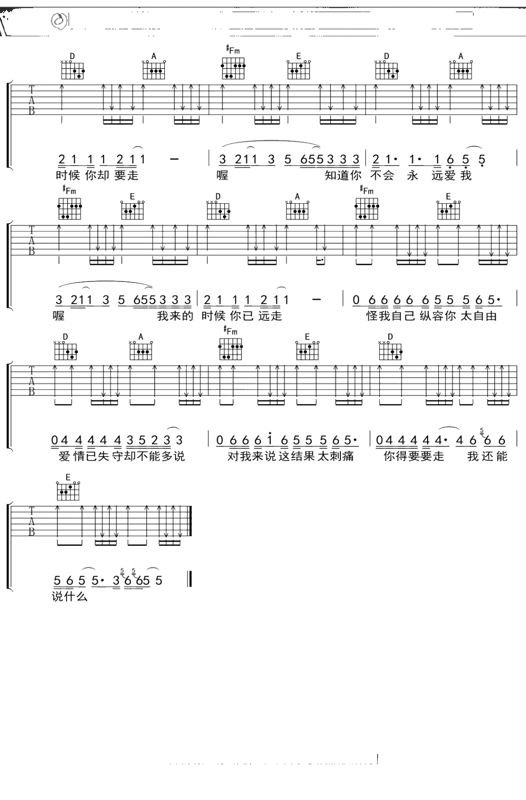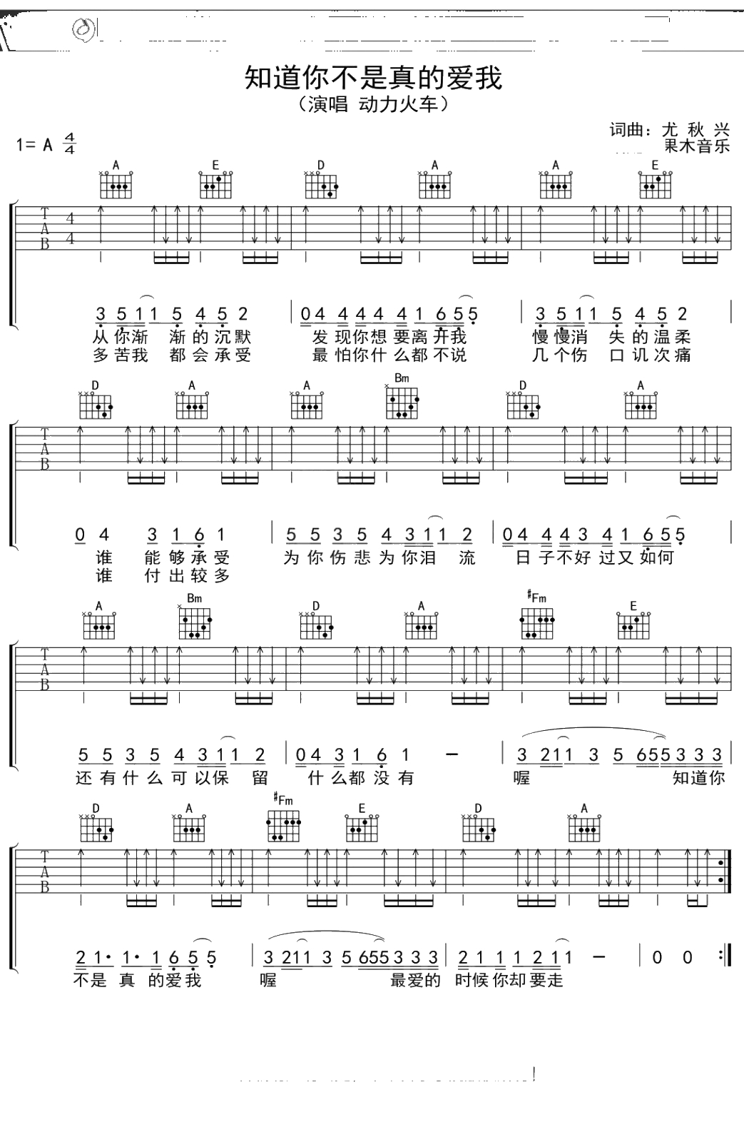 动力火车《知道你不是真的爱我》吉他谱 弹唱六线谱