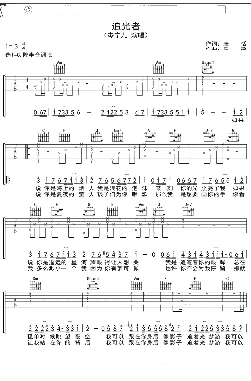 岑宁儿《追光者》吉他谱 弹唱六线谱