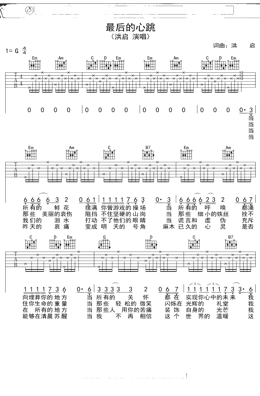 洪启《最后的心跳》吉他谱 弹唱六线谱