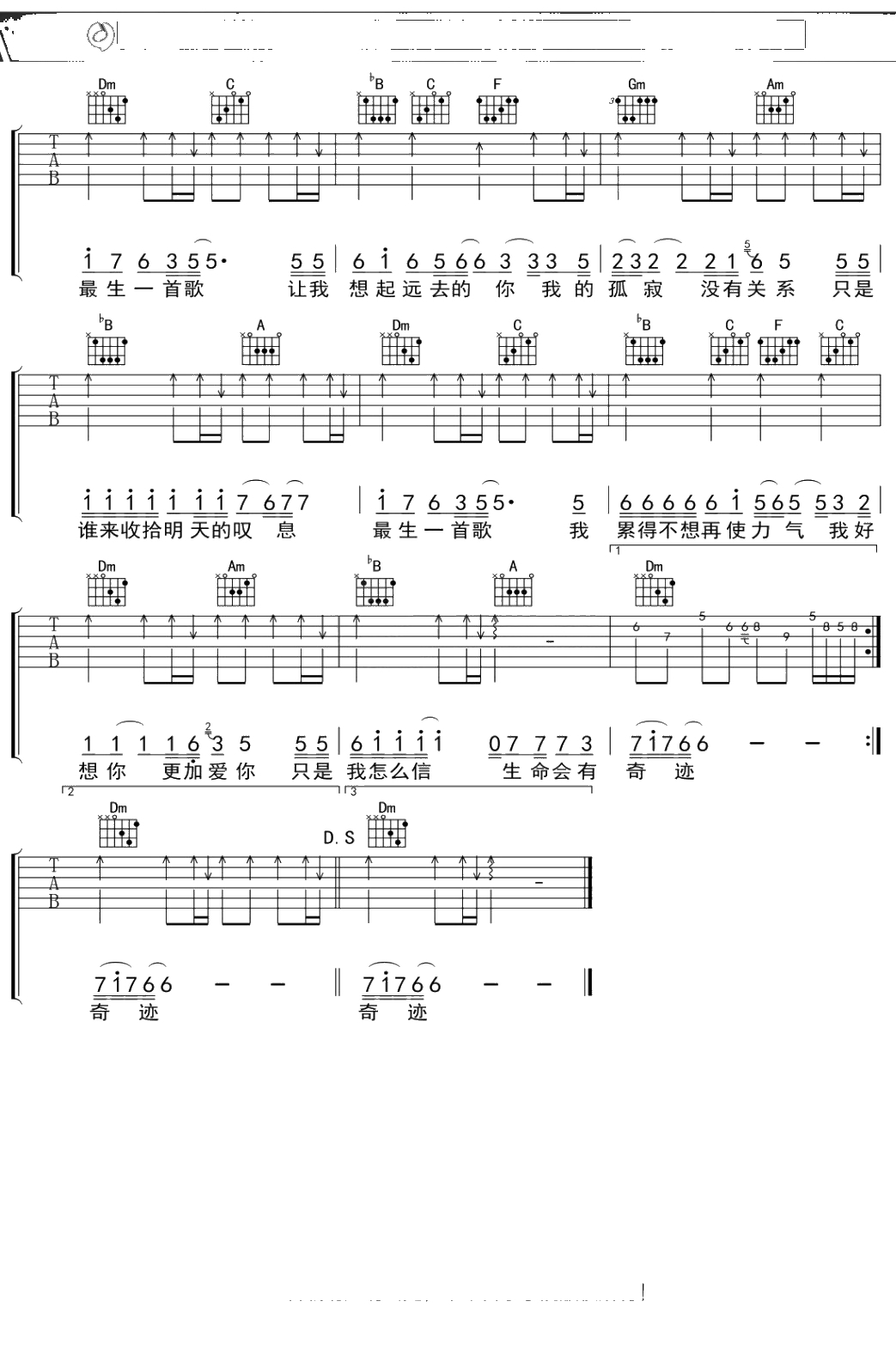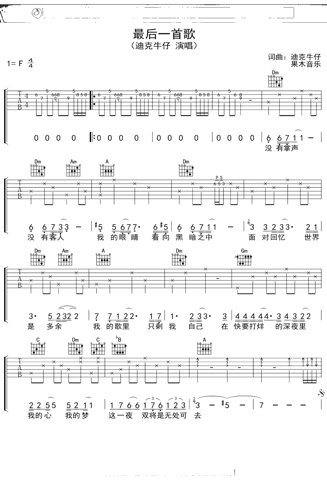 迪克牛仔《最后一首歌》吉他谱 弹唱六线谱