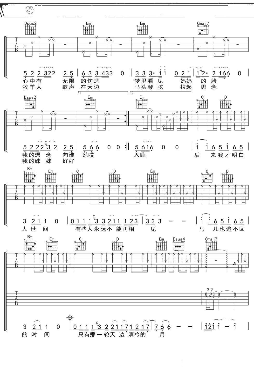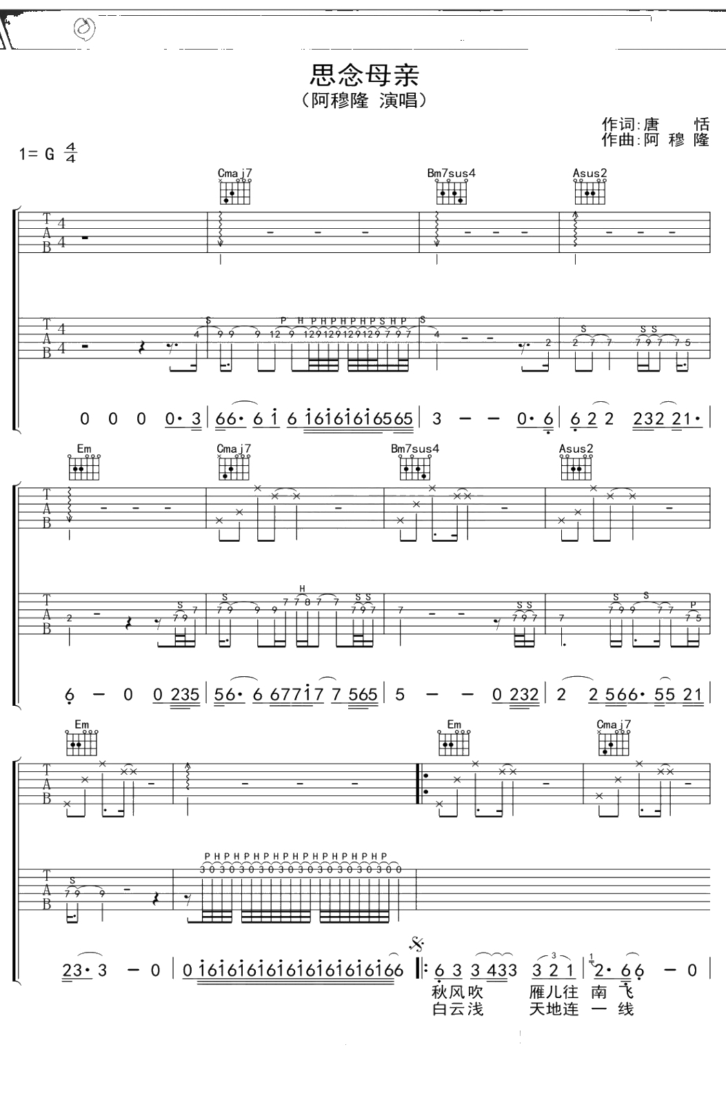 阿穆隆《思念母亲》吉他谱 弹唱六线谱