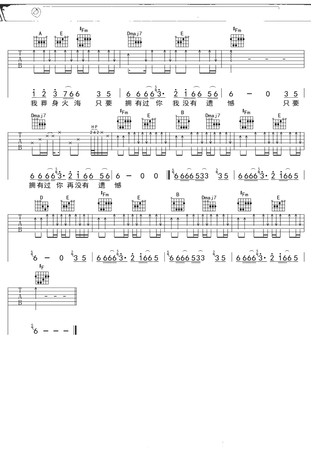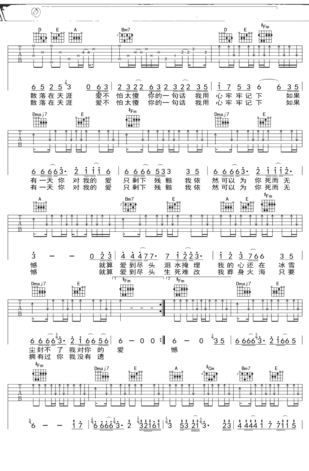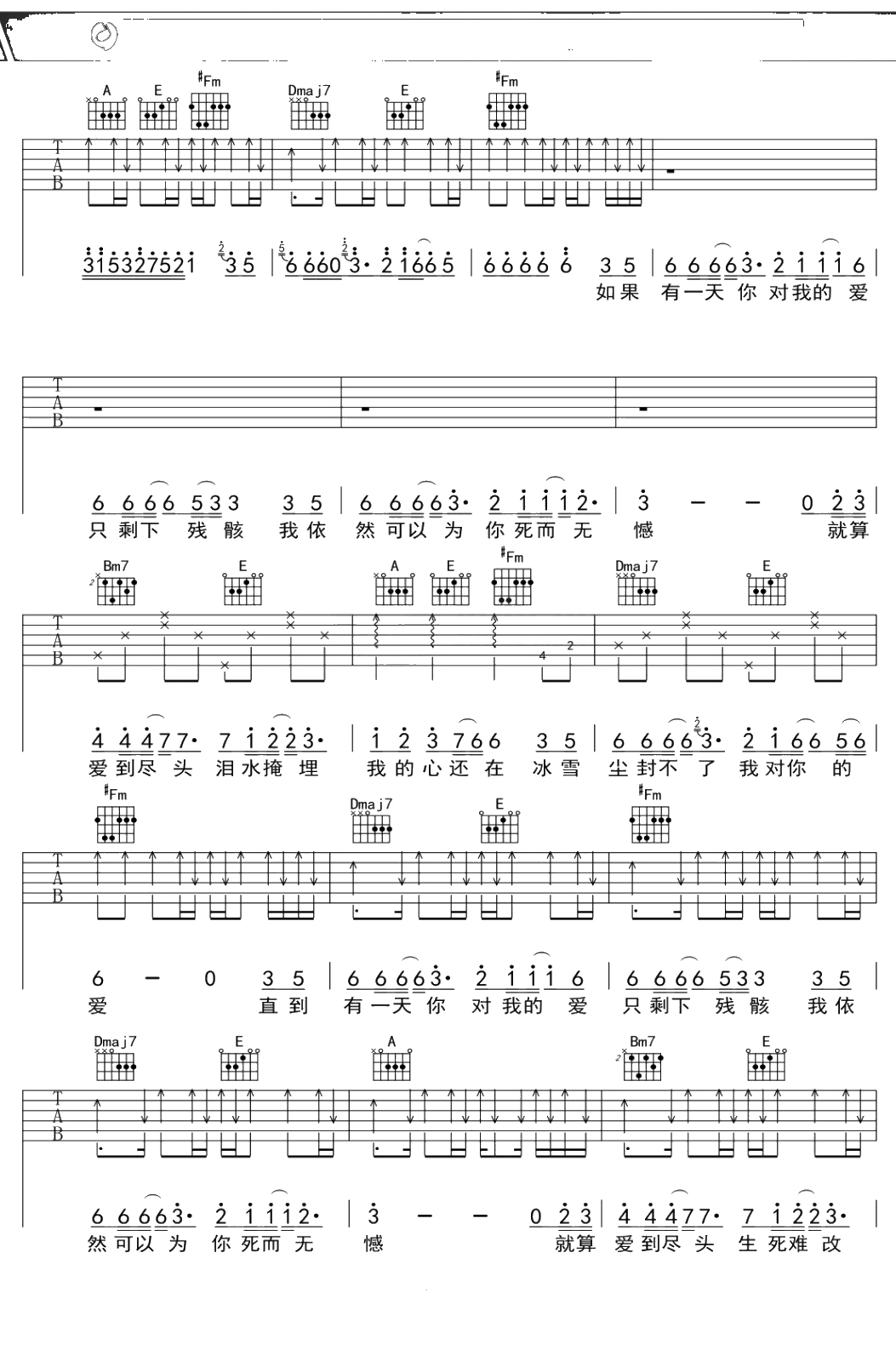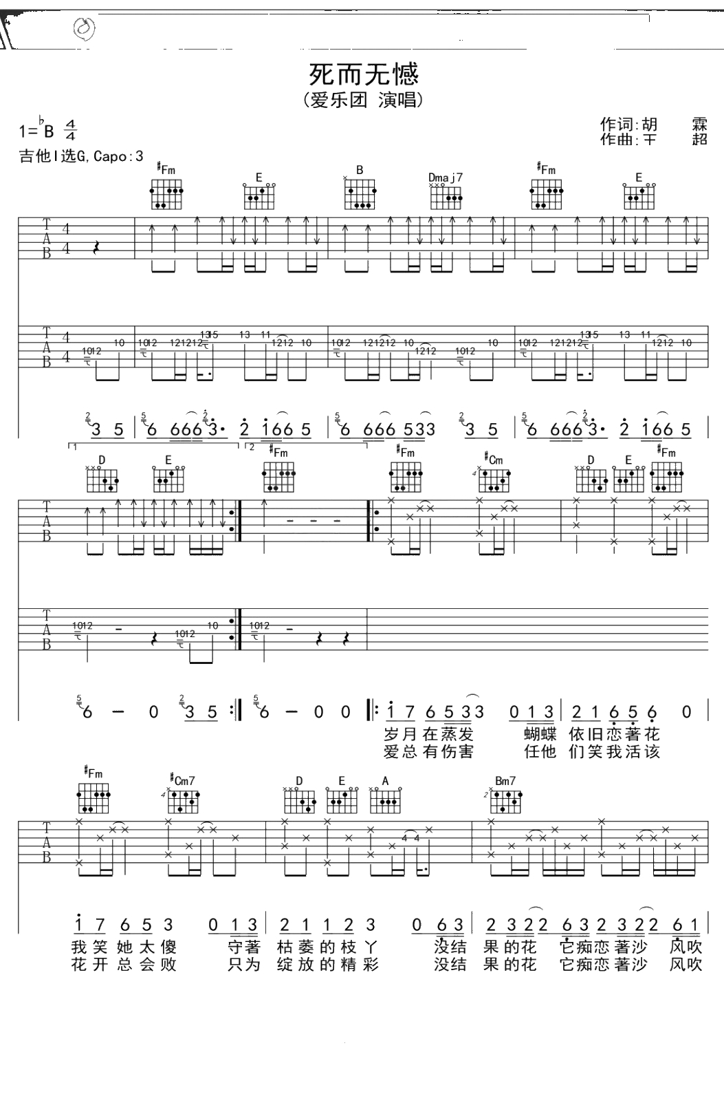 爱乐团《死而无憾》吉他谱 弹唱六线谱