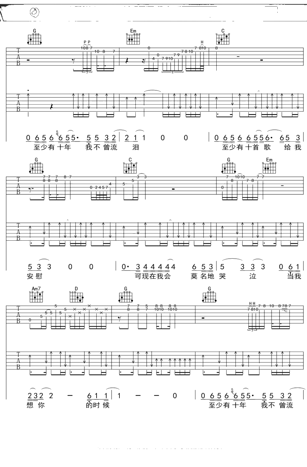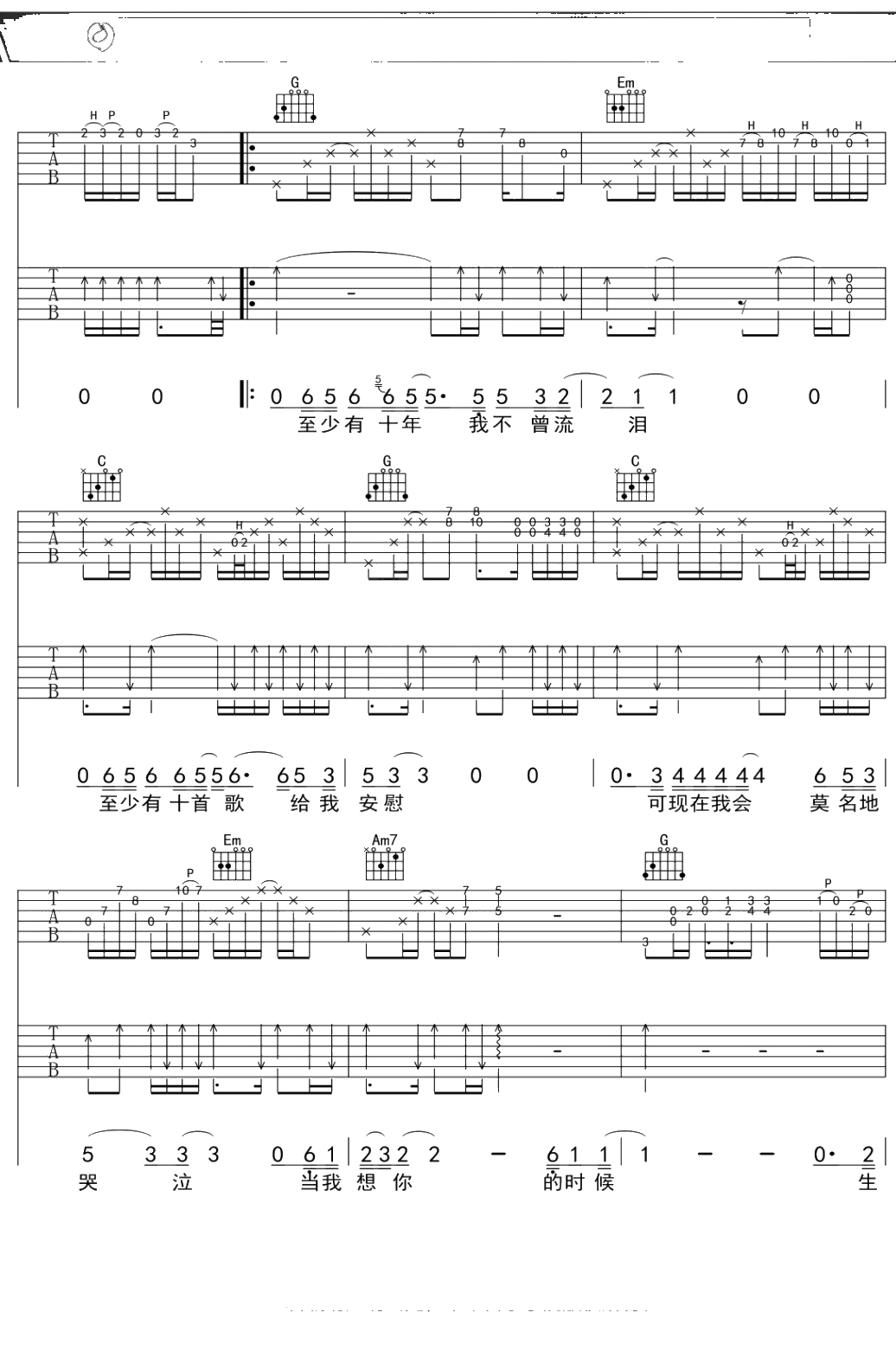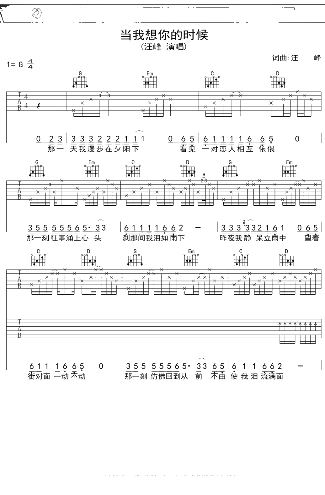 汪峰《当我想你的时候》吉他谱 弹唱六线谱