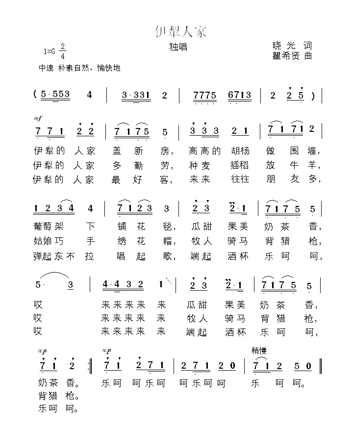 伊犁人家简谱-晓光词/瞿希贤曲简谱