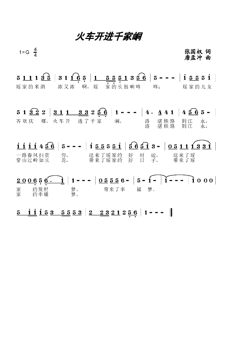 火车开进千家峒简谱-张国权词/唐孟冲曲
