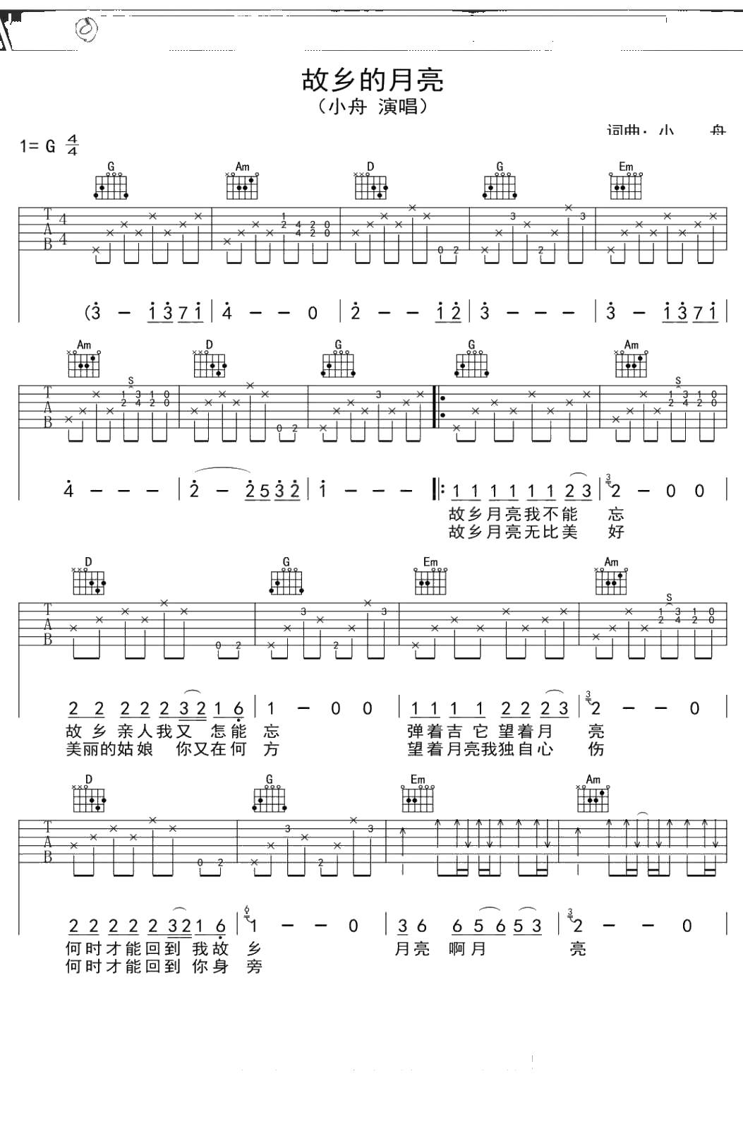 故乡的月亮吉他谱 小舟 G调吉他弹唱曲谱