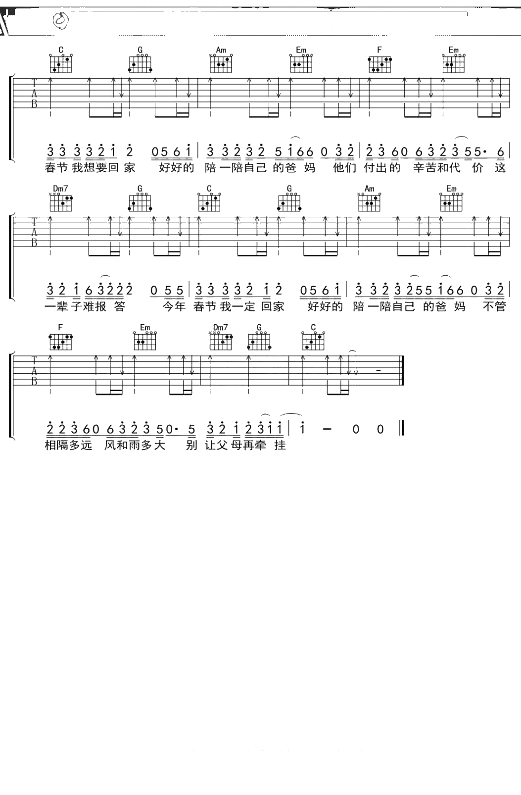 回家陪爸妈吉他谱 小沈阳 C调吉他弹唱曲谱吉他谱