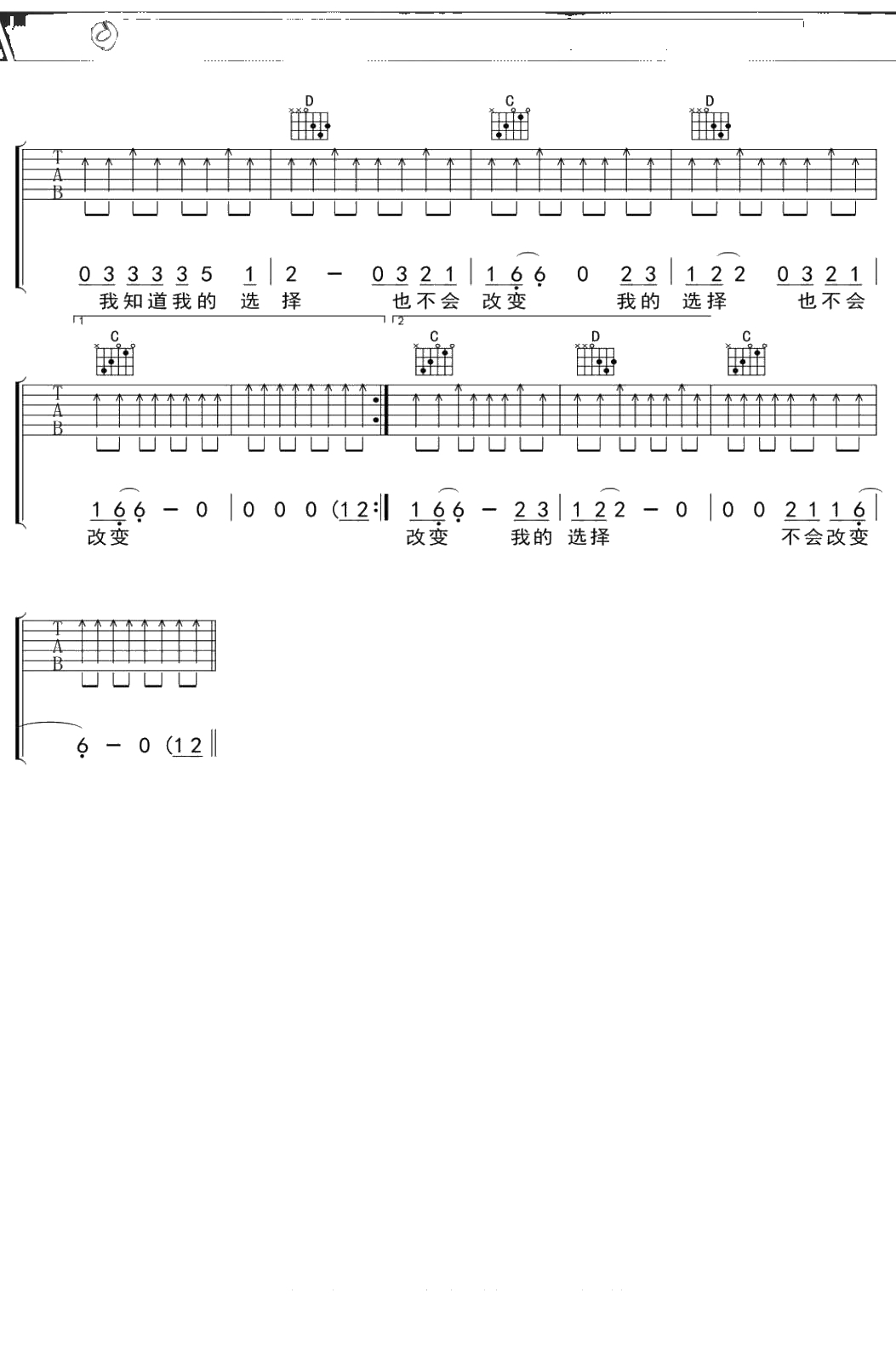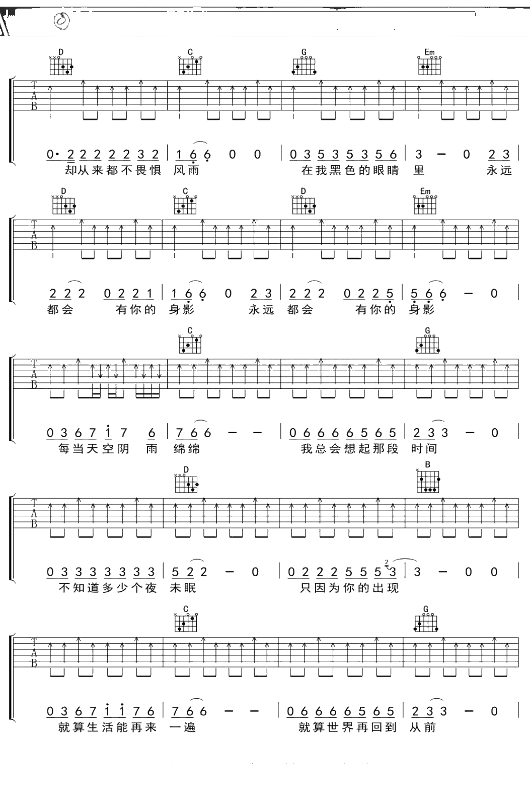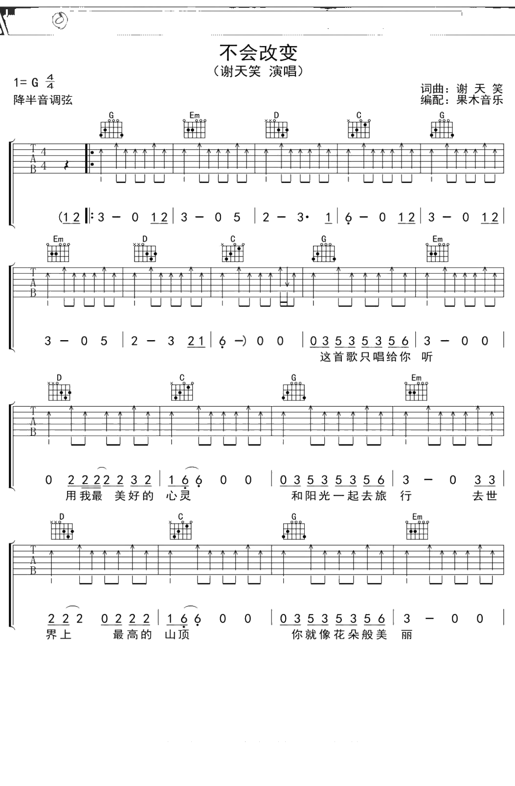 不会改变吉他谱 谢天笑 G调吉他弹唱曲谱吉他谱