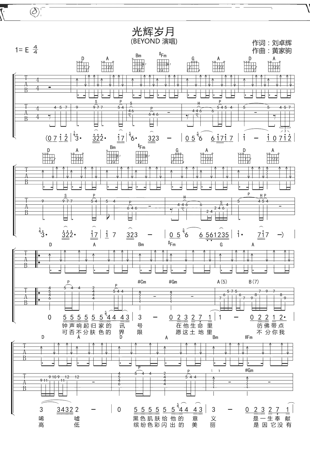 beyond《光辉岁月》吉他谱 E调弹唱六线谱双吉他版