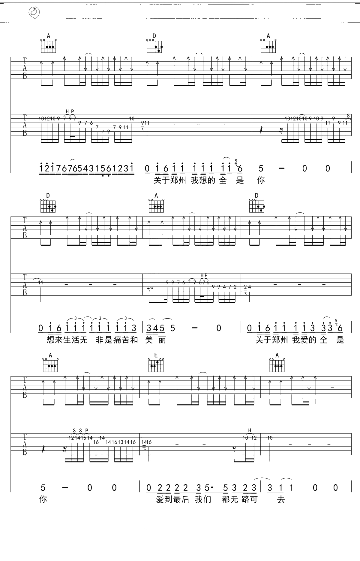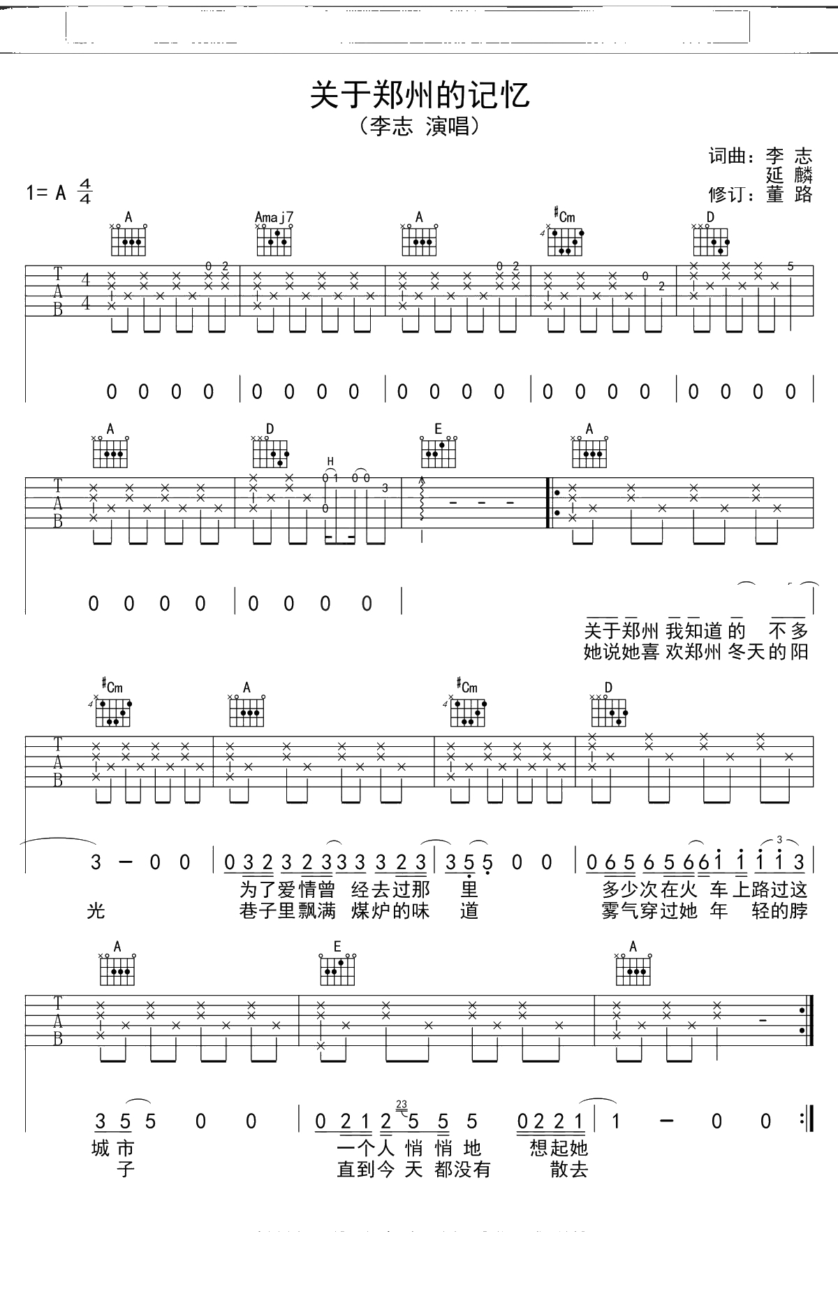 李志《关于郑州的记忆》吉他谱 A调弹唱六线谱吉他谱