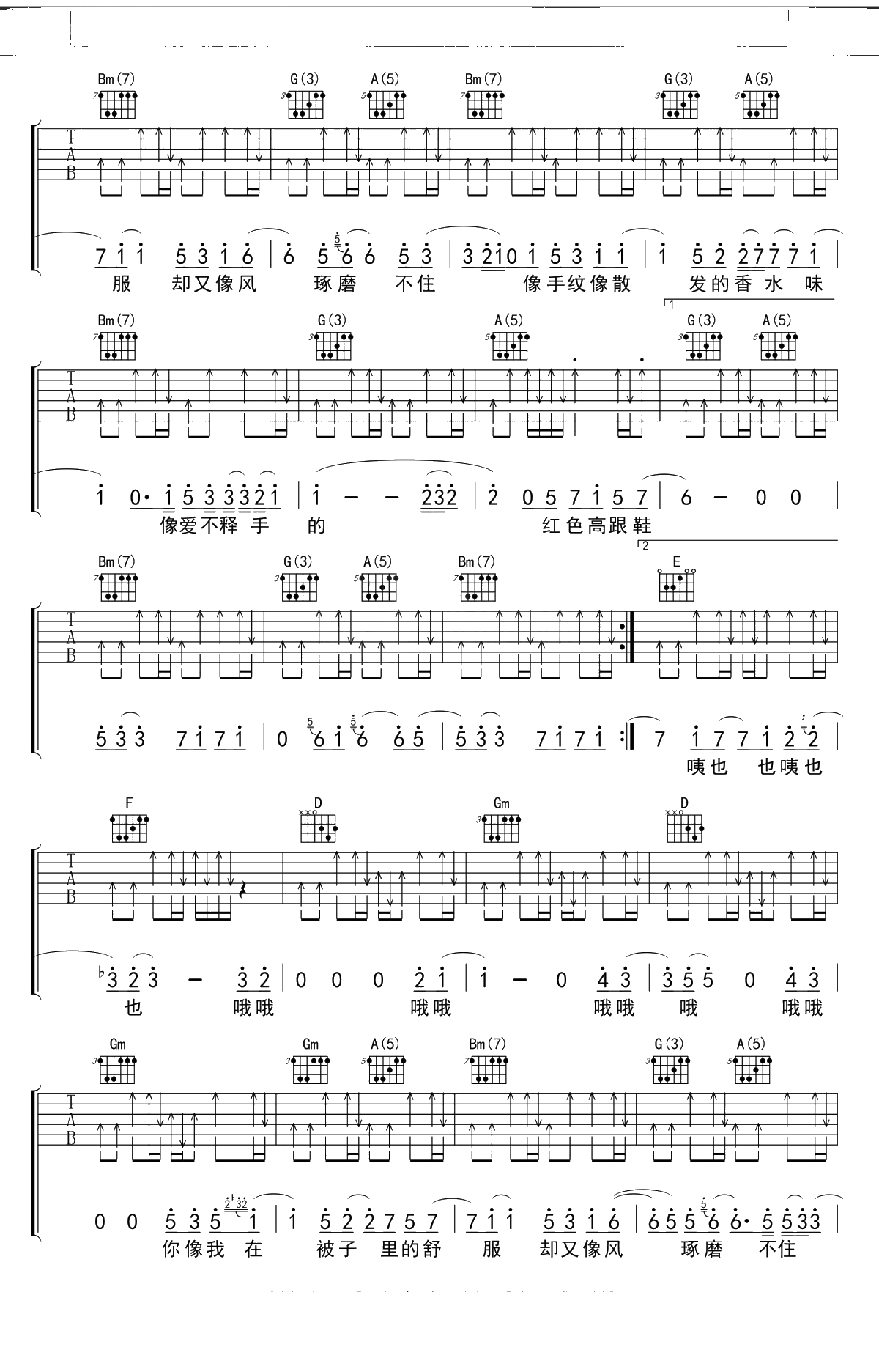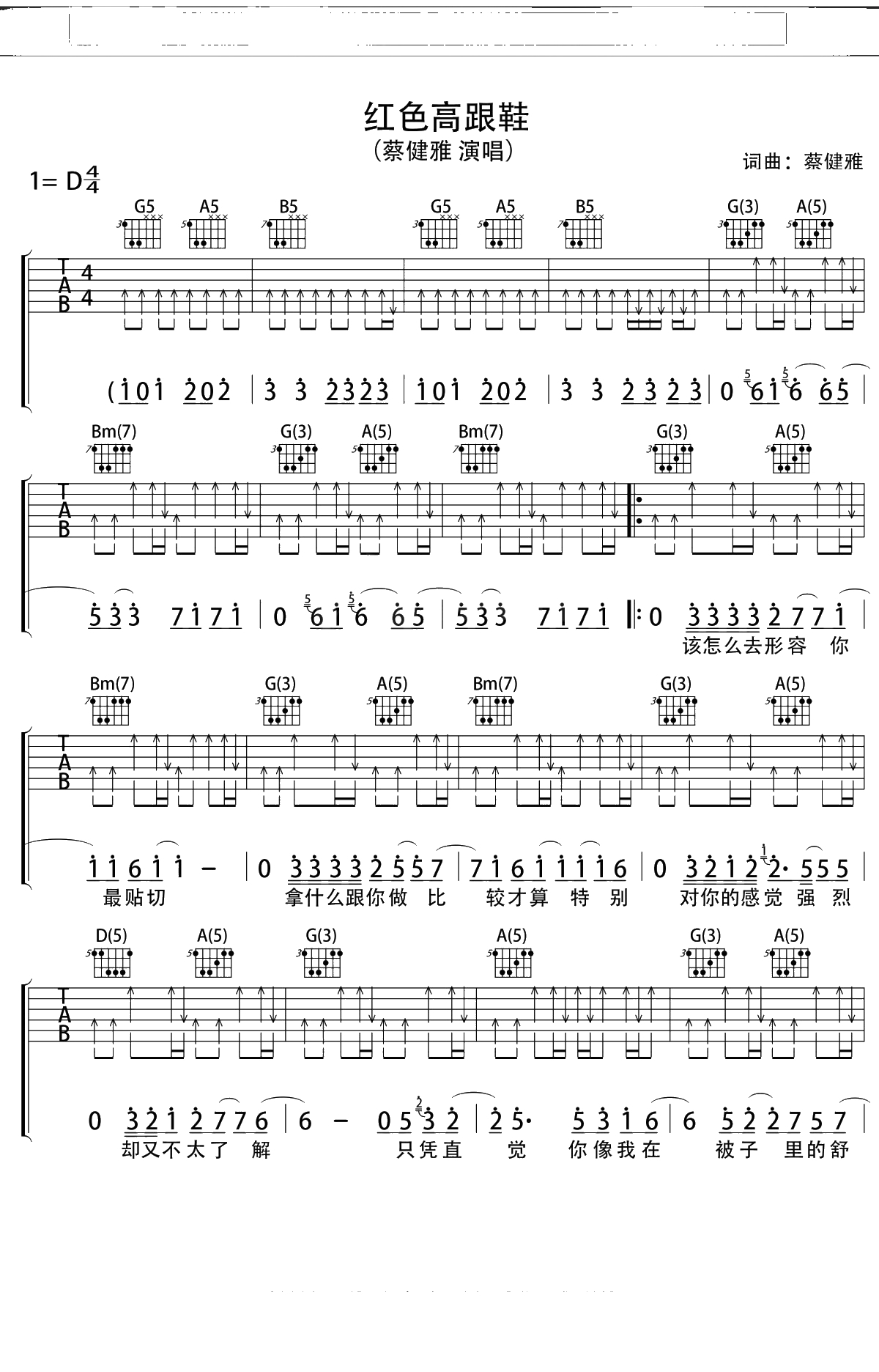 蔡健雅《红色高跟鞋》吉他谱 D调弹唱六线谱吉他谱