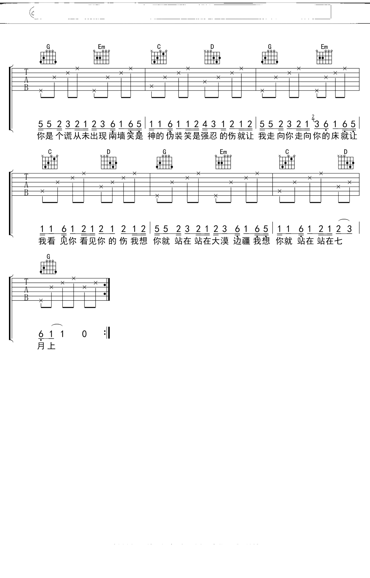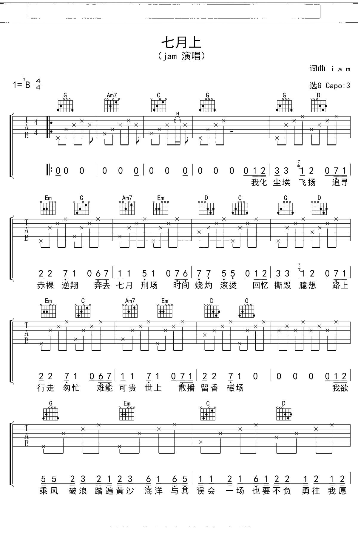 Jam《七月上》吉他谱 B调弹唱六线谱吉他谱