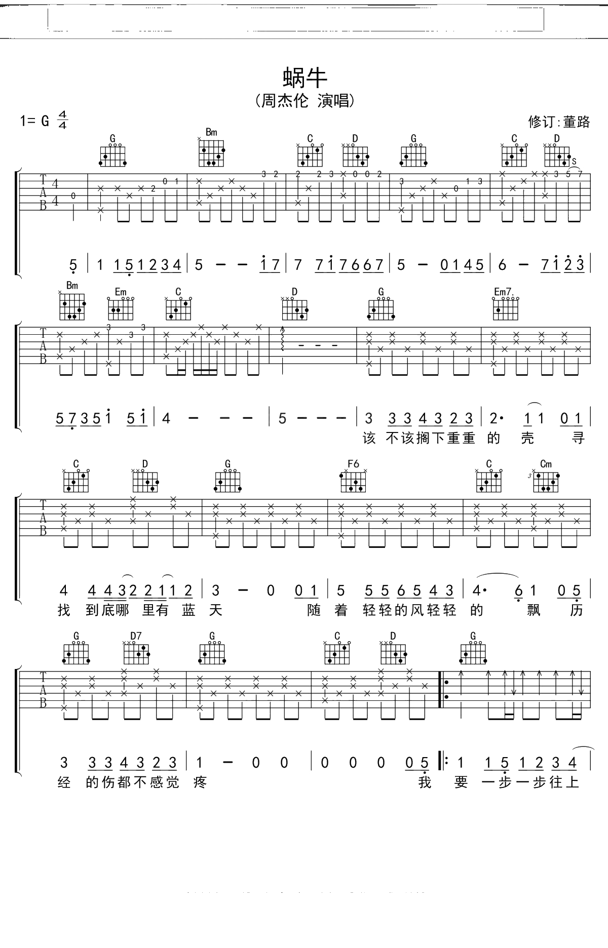 周杰伦《蜗牛》吉他谱 G调弹唱六线谱吉他谱