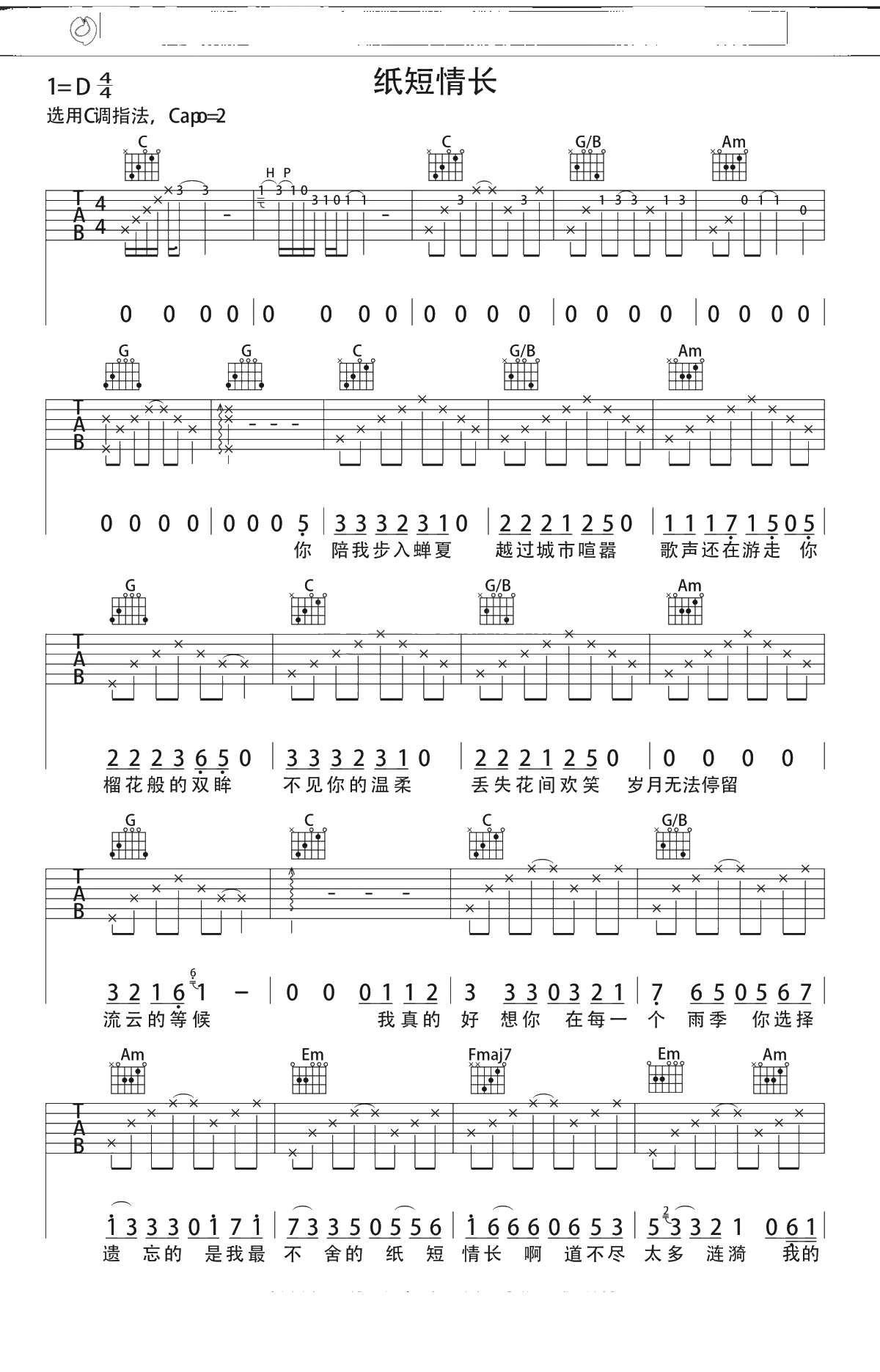 烟把儿乐队《纸短情长》吉他谱 C调弹唱六线谱