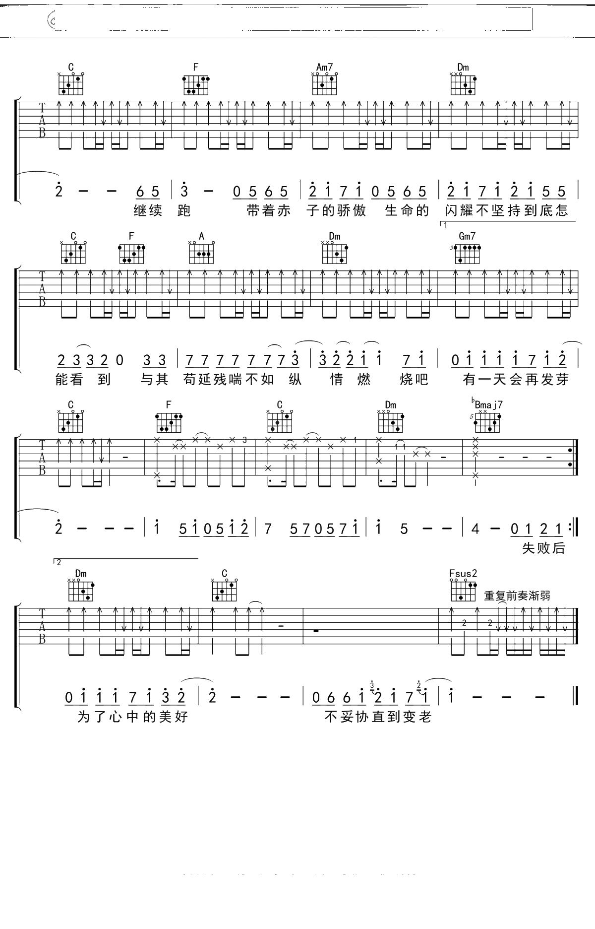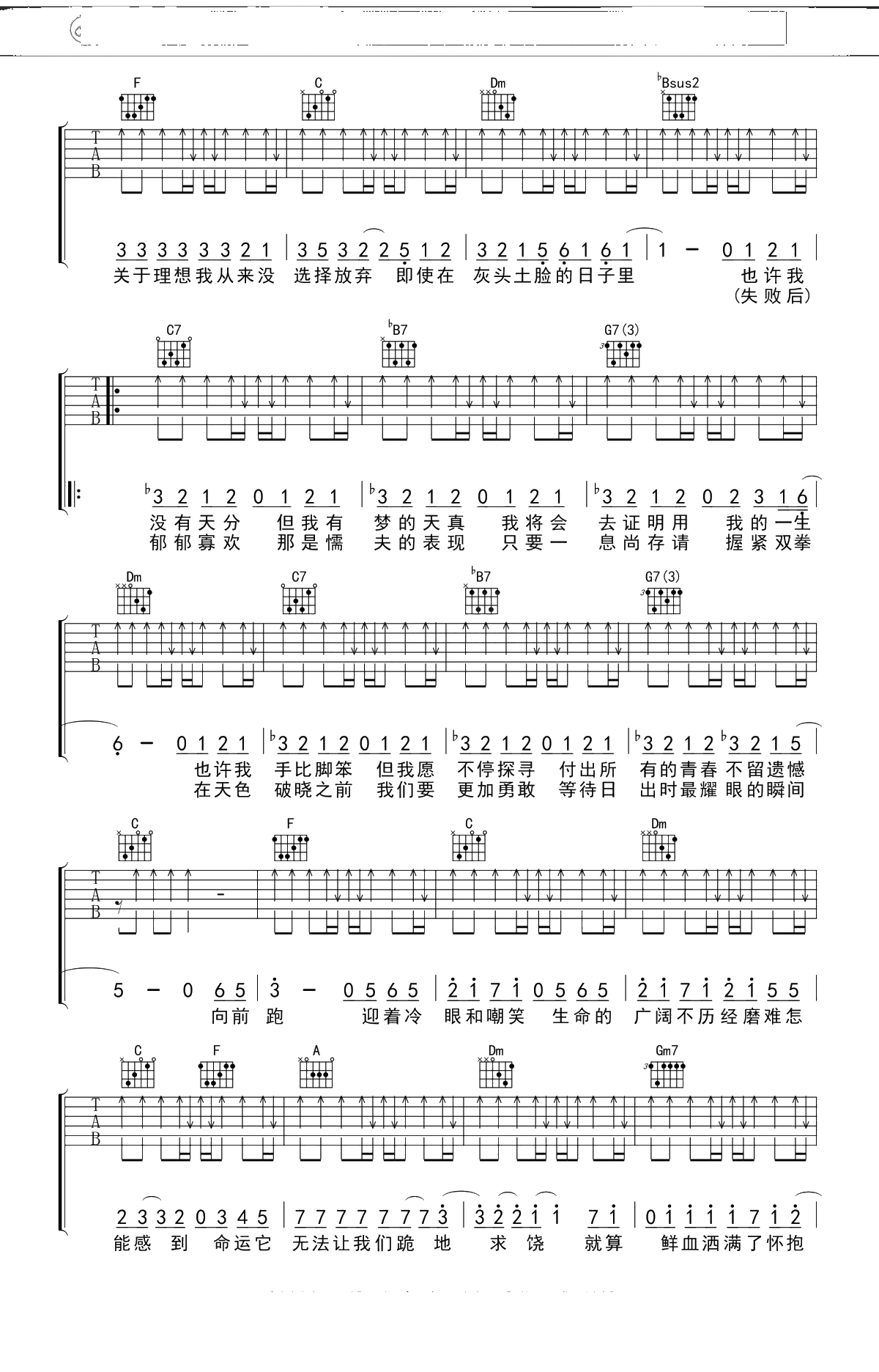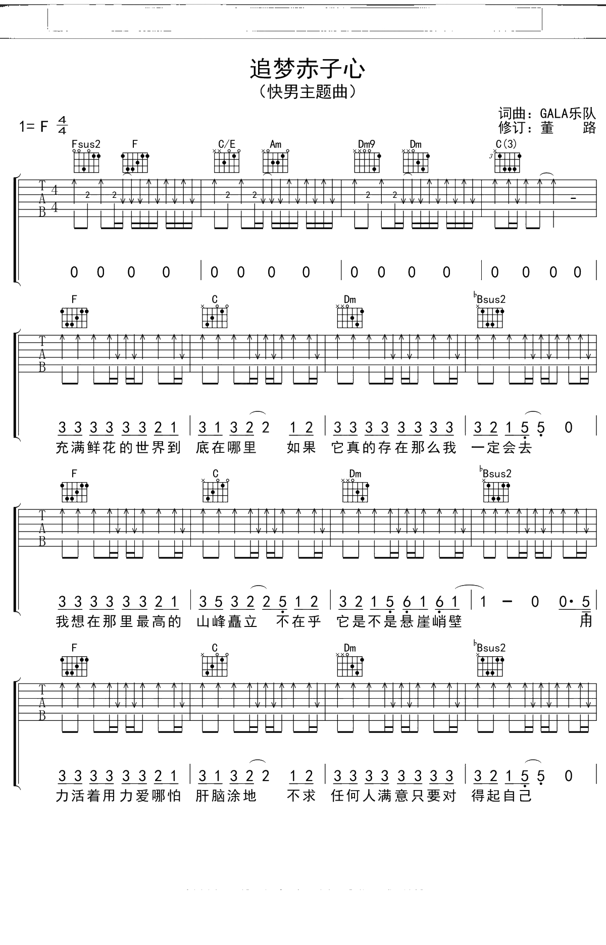 GALA乐队《追梦赤子心》吉他谱 F调弹唱六线谱吉他谱
