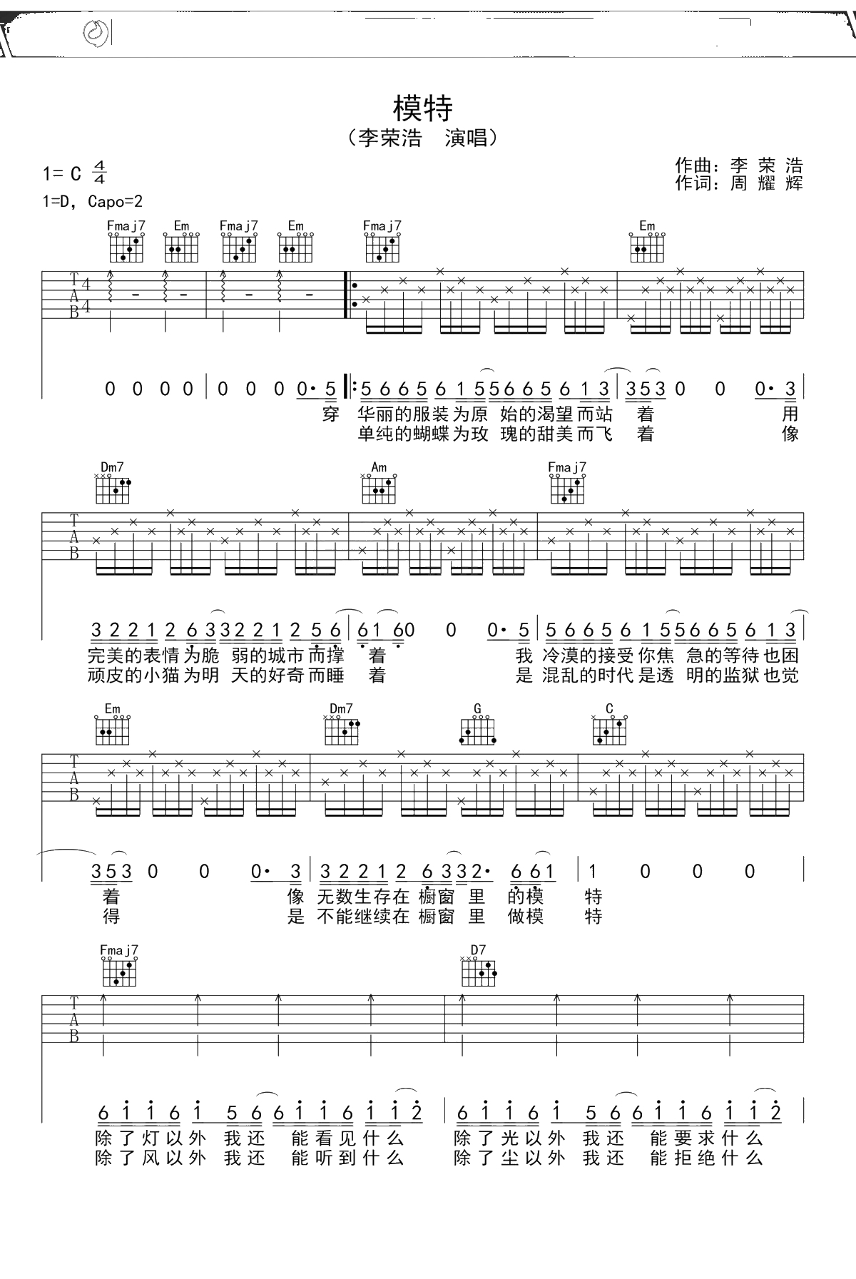 李荣浩《模特》吉他谱 D调弹唱六线谱