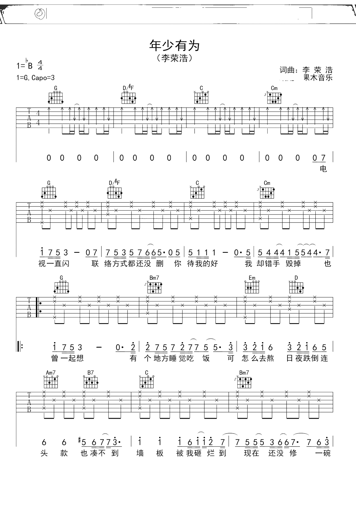 李荣浩《年少有为》吉他谱 G调弹唱六线谱