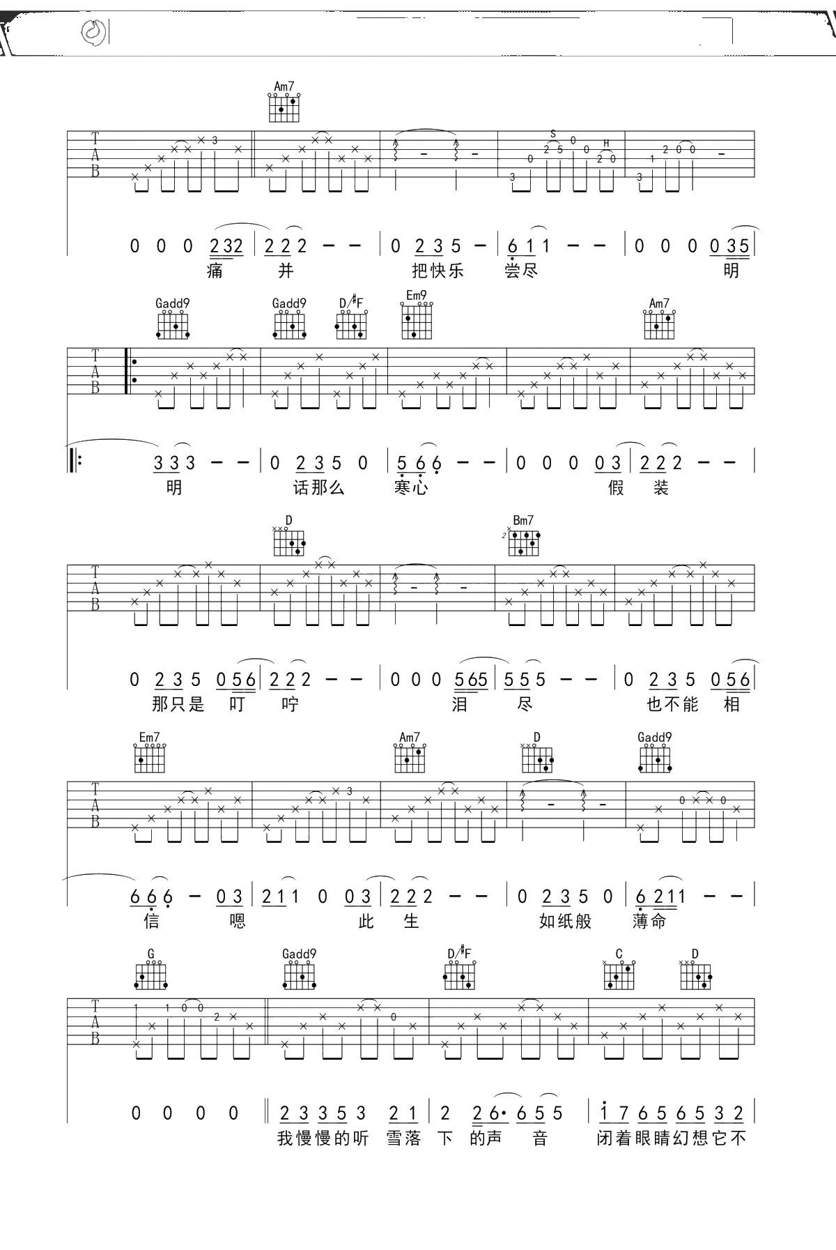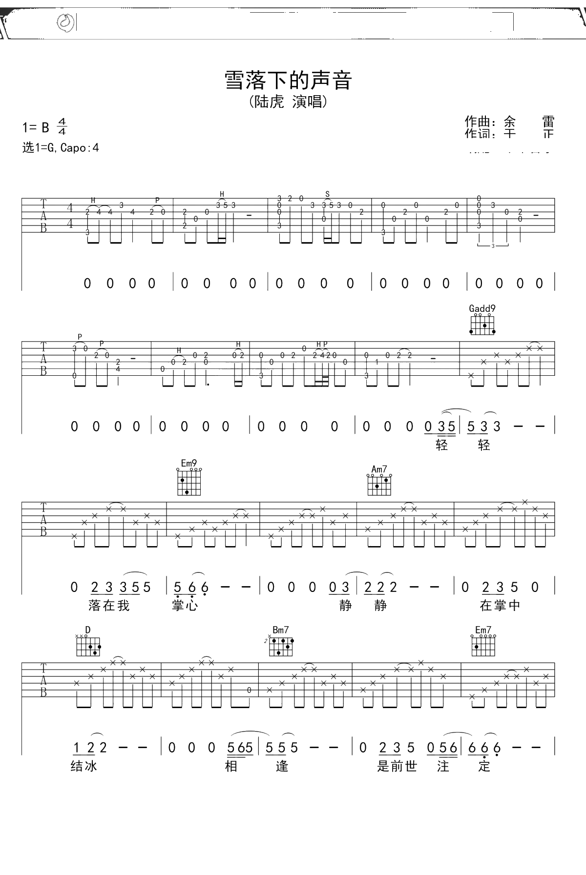 《雪落下的声音》吉他谱 秦岚/陆虎 G调弹唱六线谱吉他谱
