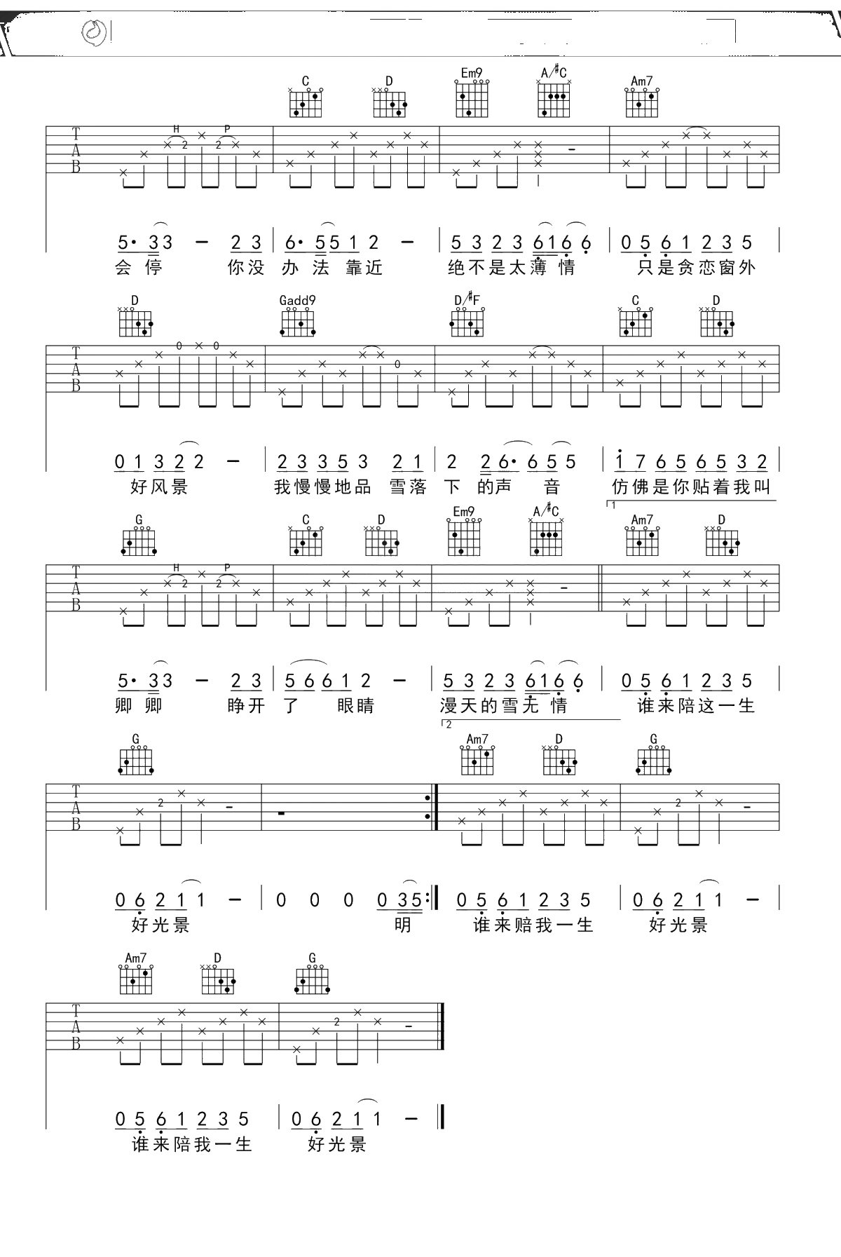 《雪落下的声音》吉他谱 秦岚/陆虎 G调弹唱六线谱
