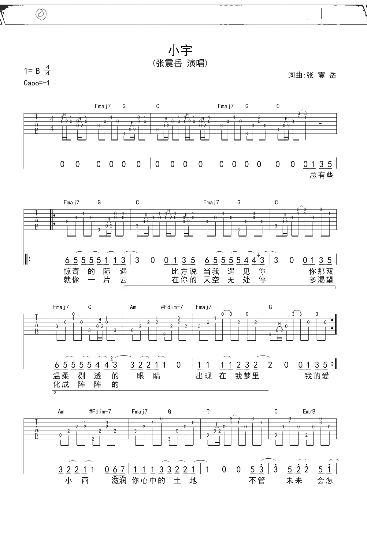 张震岳《小宇》吉他谱 弹唱六线谱