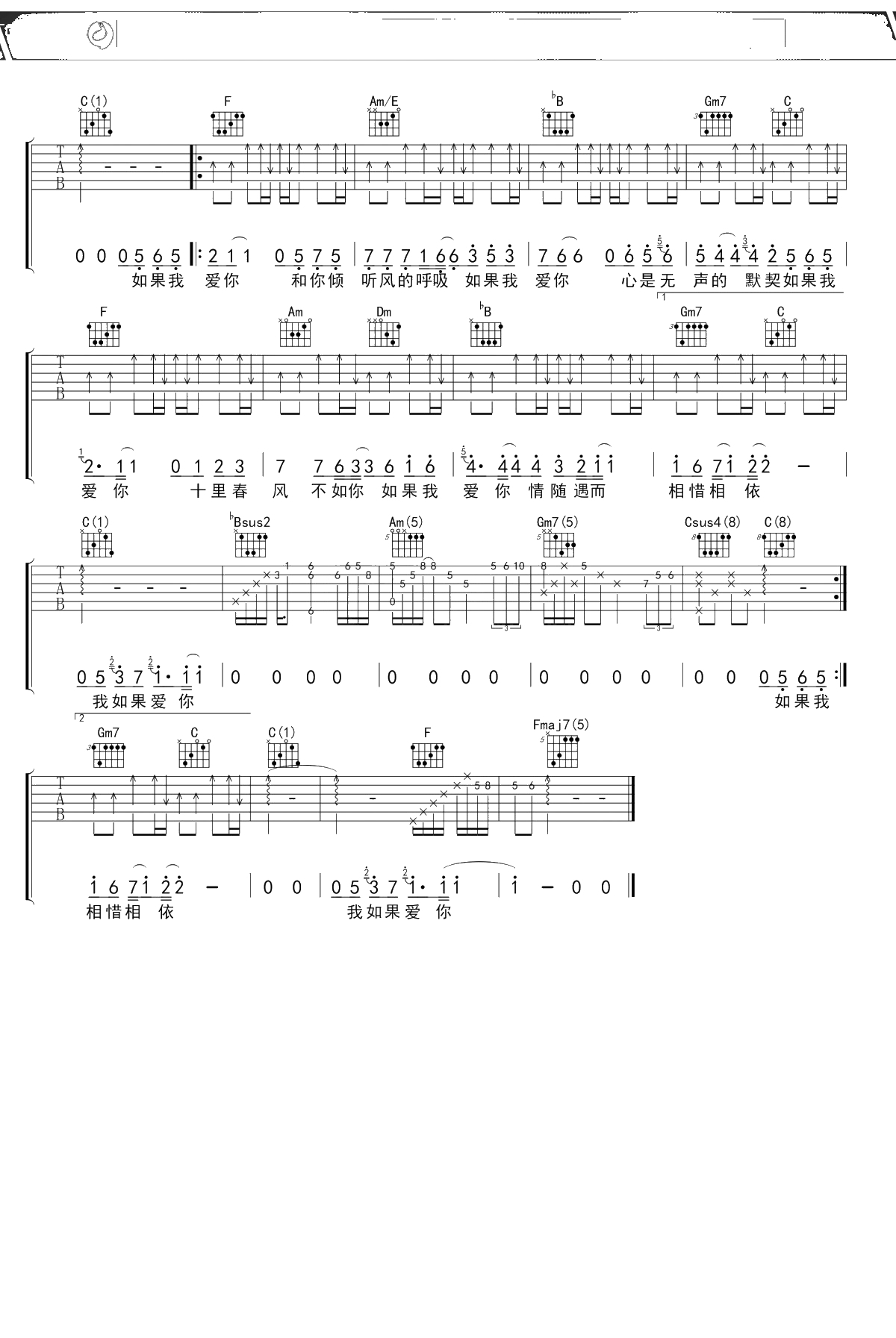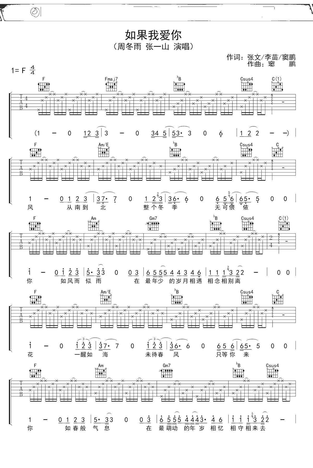 《如果我爱你》吉他谱 张一山/周冬雨 F调弹唱六线谱
