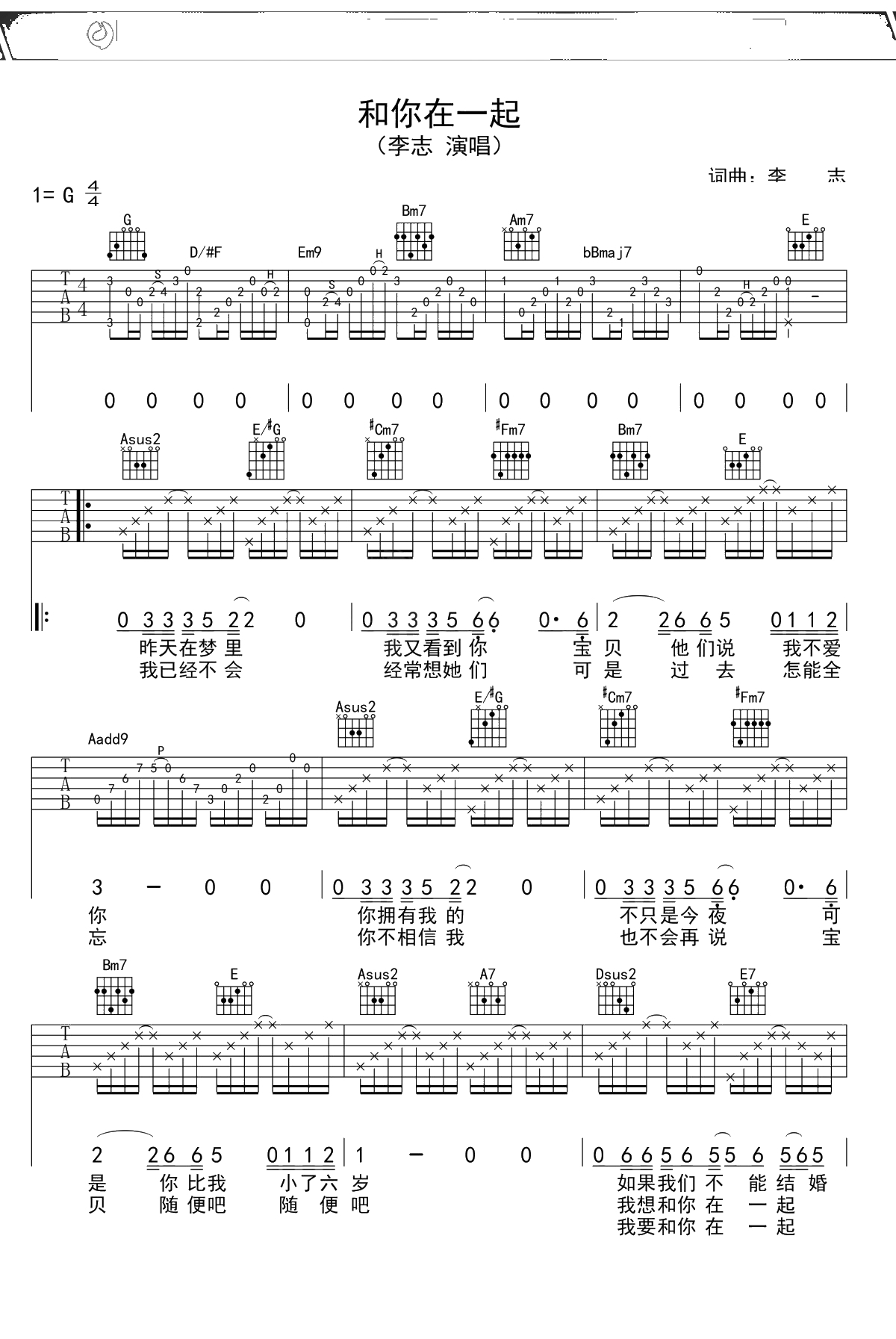 李志《和你在一起》吉他谱 G调弹唱六线谱吉他谱