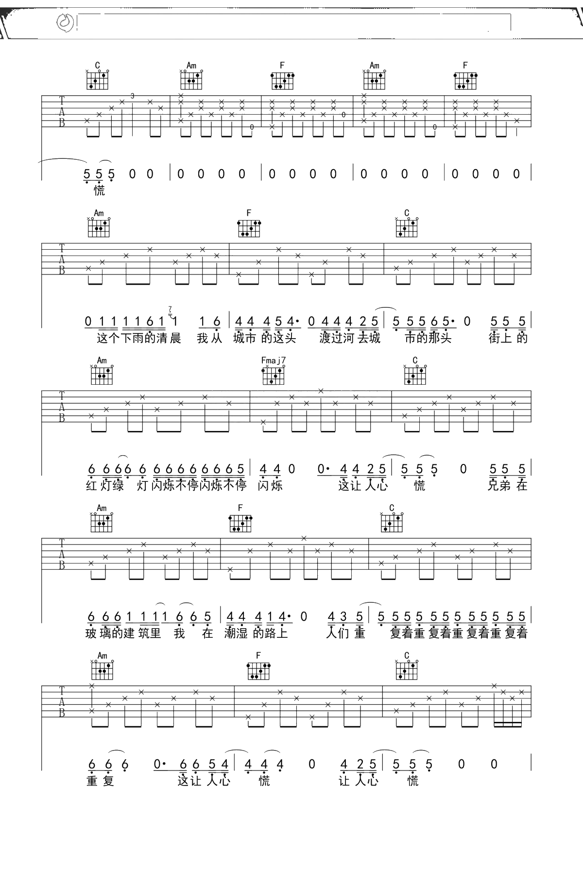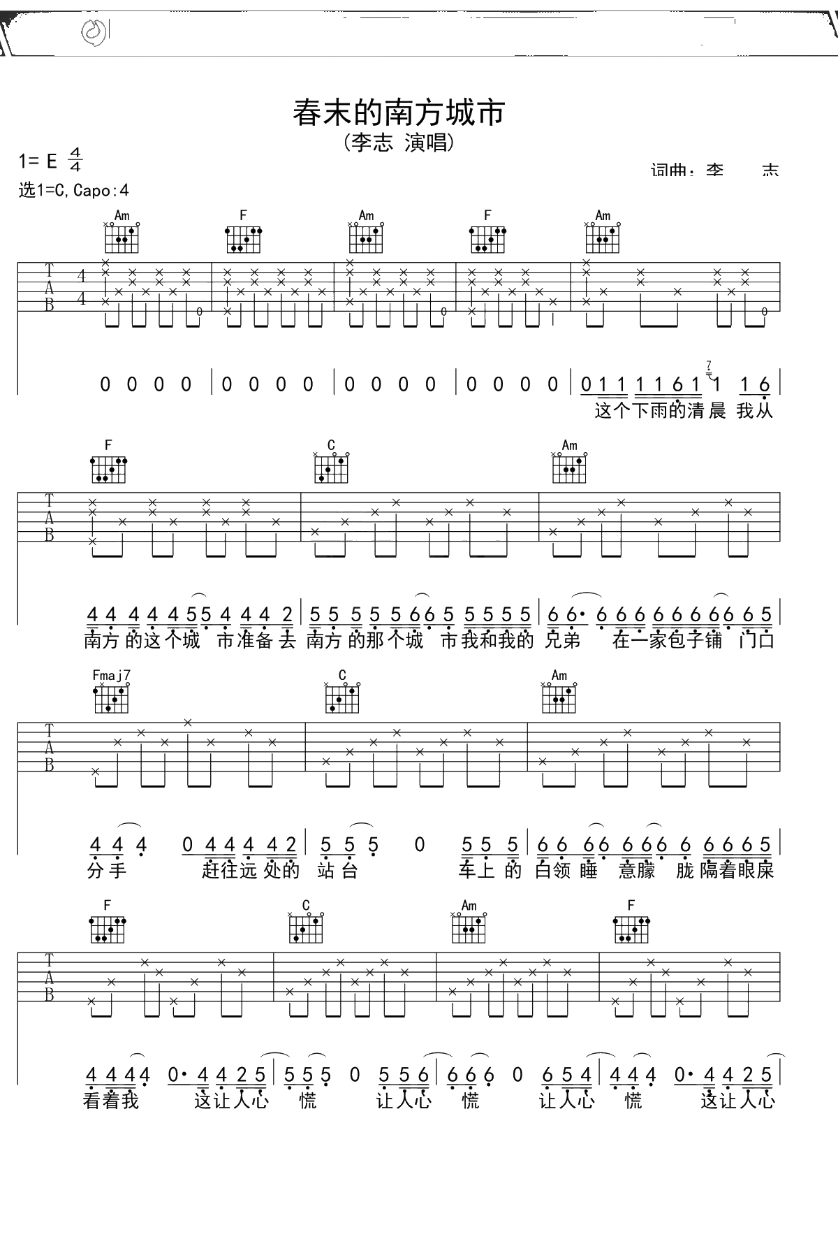 李志《春末的南方城市》吉他谱 C调弹唱六线谱吉他谱