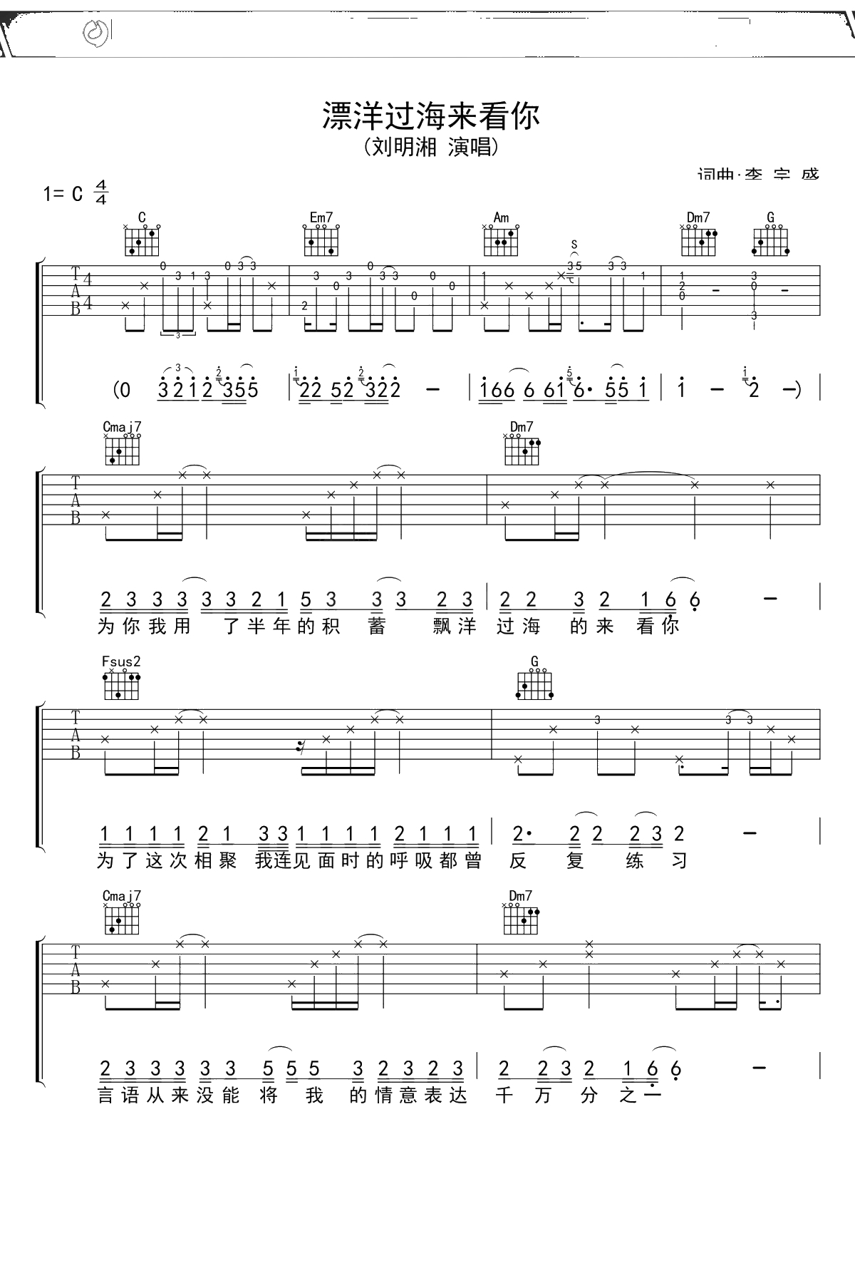 李宗盛《漂洋过海来看你》吉他谱 C调弹唱六线谱吉他谱