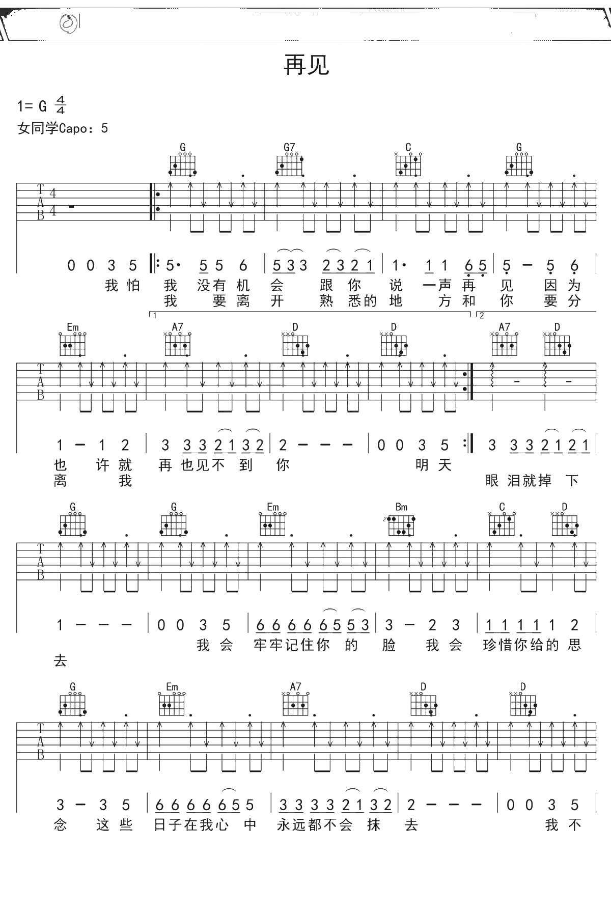 《再见》吉他谱 G调果木浪子吉他入门曲谱