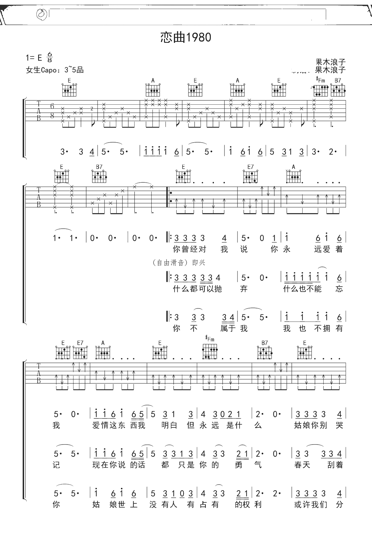 《恋曲1980》吉他谱 E调果木浪子吉他入门曲谱吉他谱
