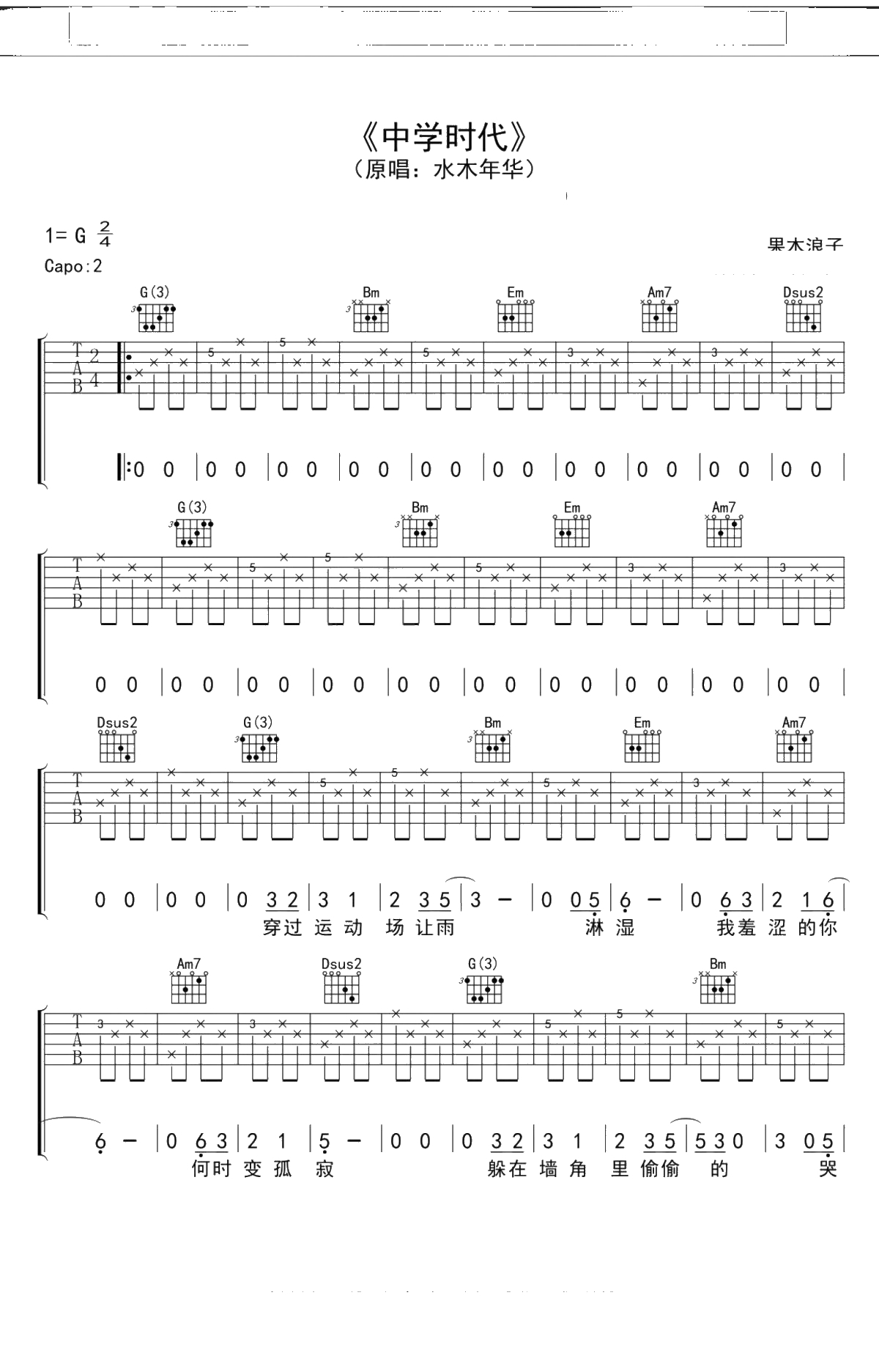 《中学时代》吉他谱 G调果木浪子吉他弹唱曲谱