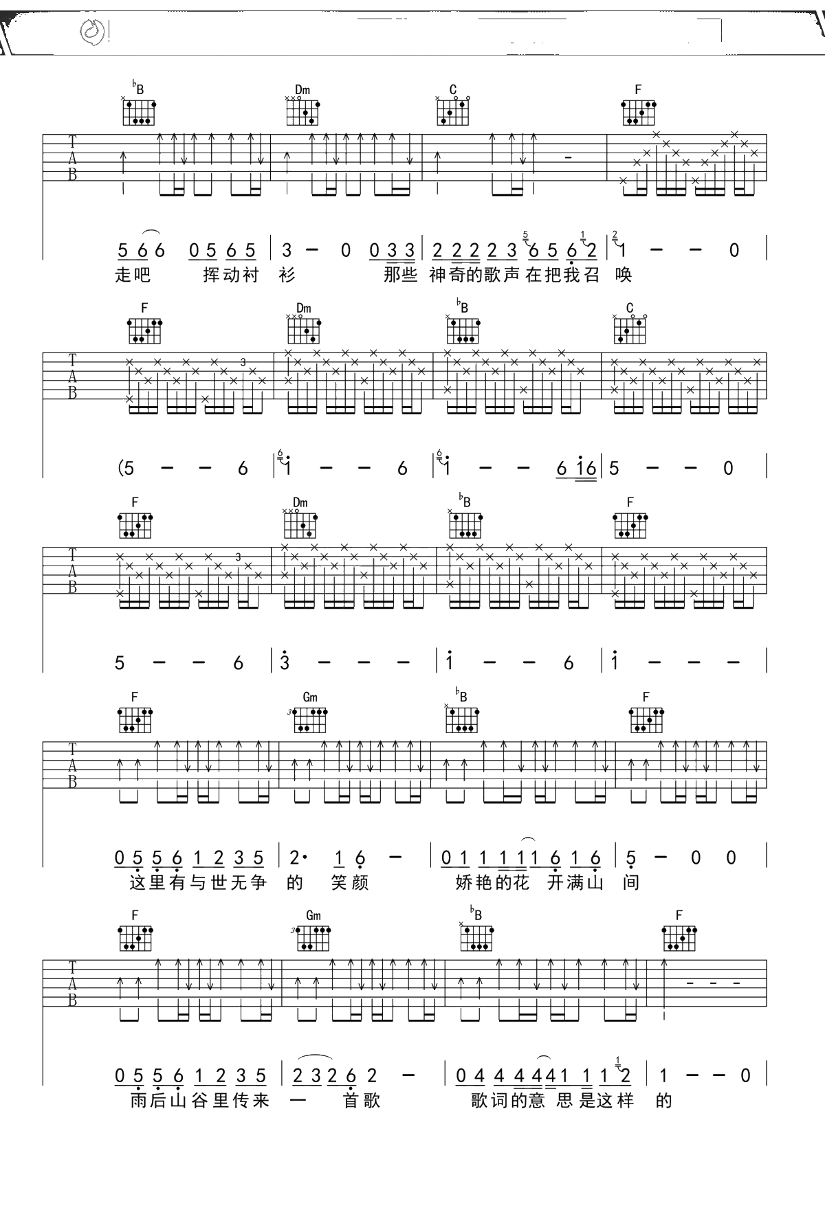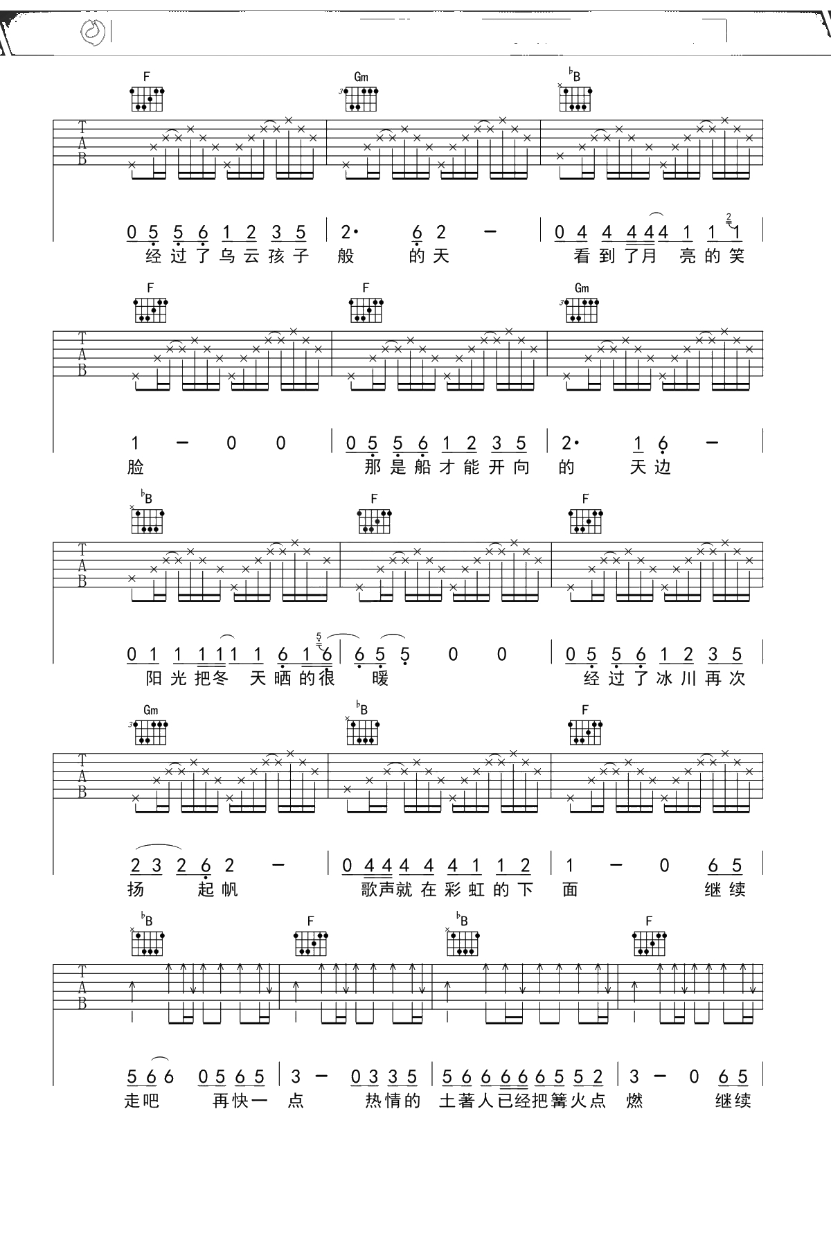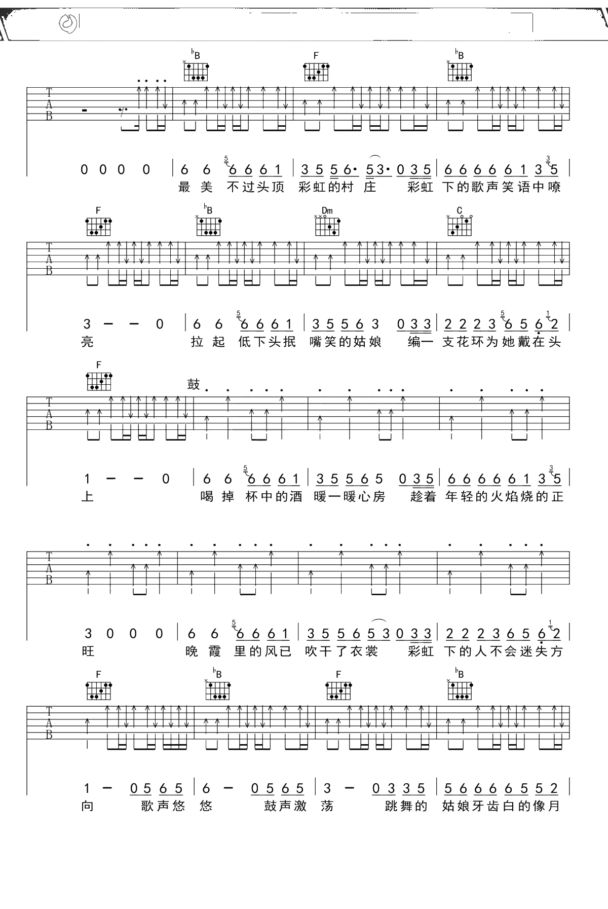 赵雷《彩虹下面》吉他谱 F调弹唱六线谱吉他谱
