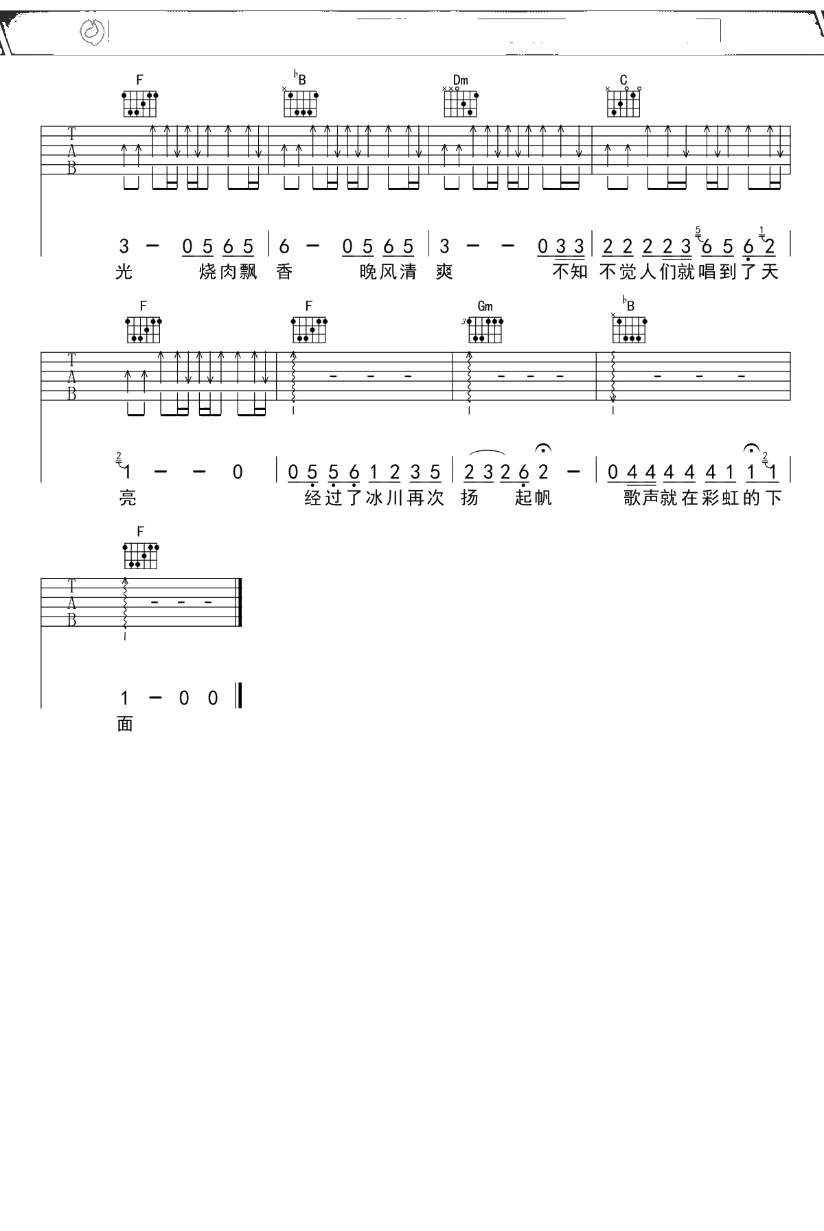 赵雷《彩虹下面》吉他谱 F调弹唱六线谱