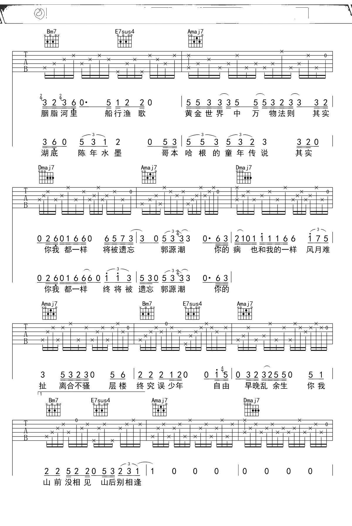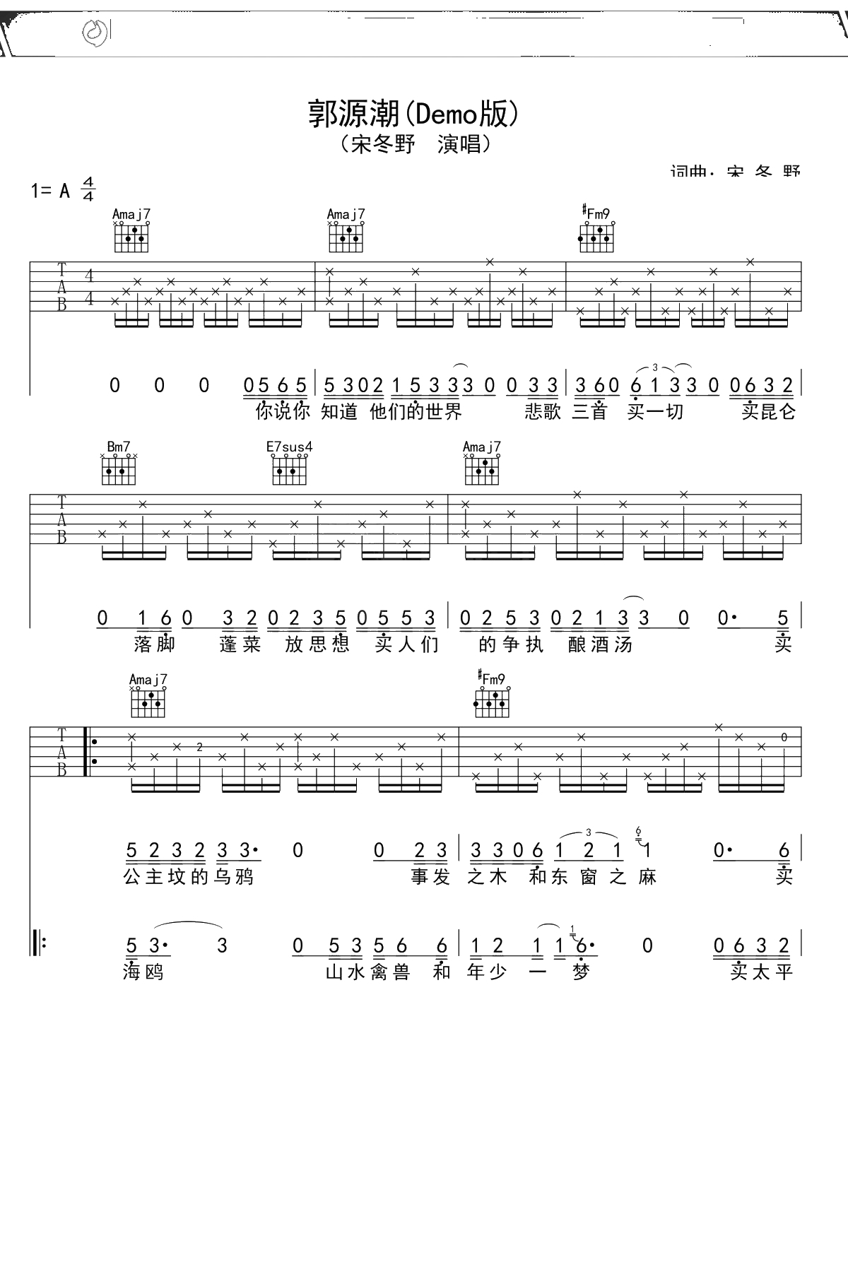 宋冬野《郭源潮》吉他谱 A调弹唱六线谱吉他谱