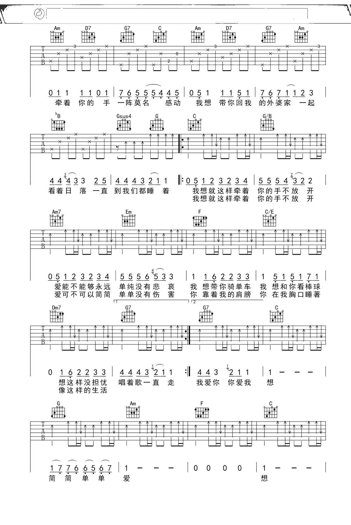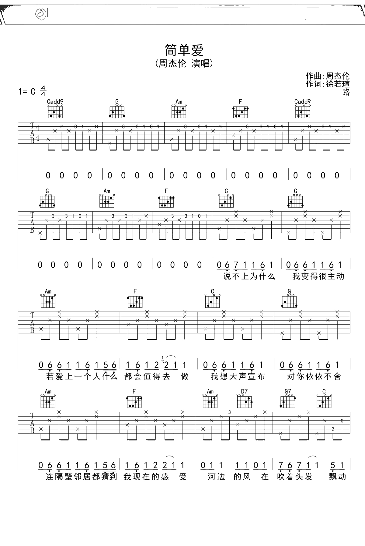 周杰伦《简单爱》吉他谱 C调弹唱六线谱吉他谱