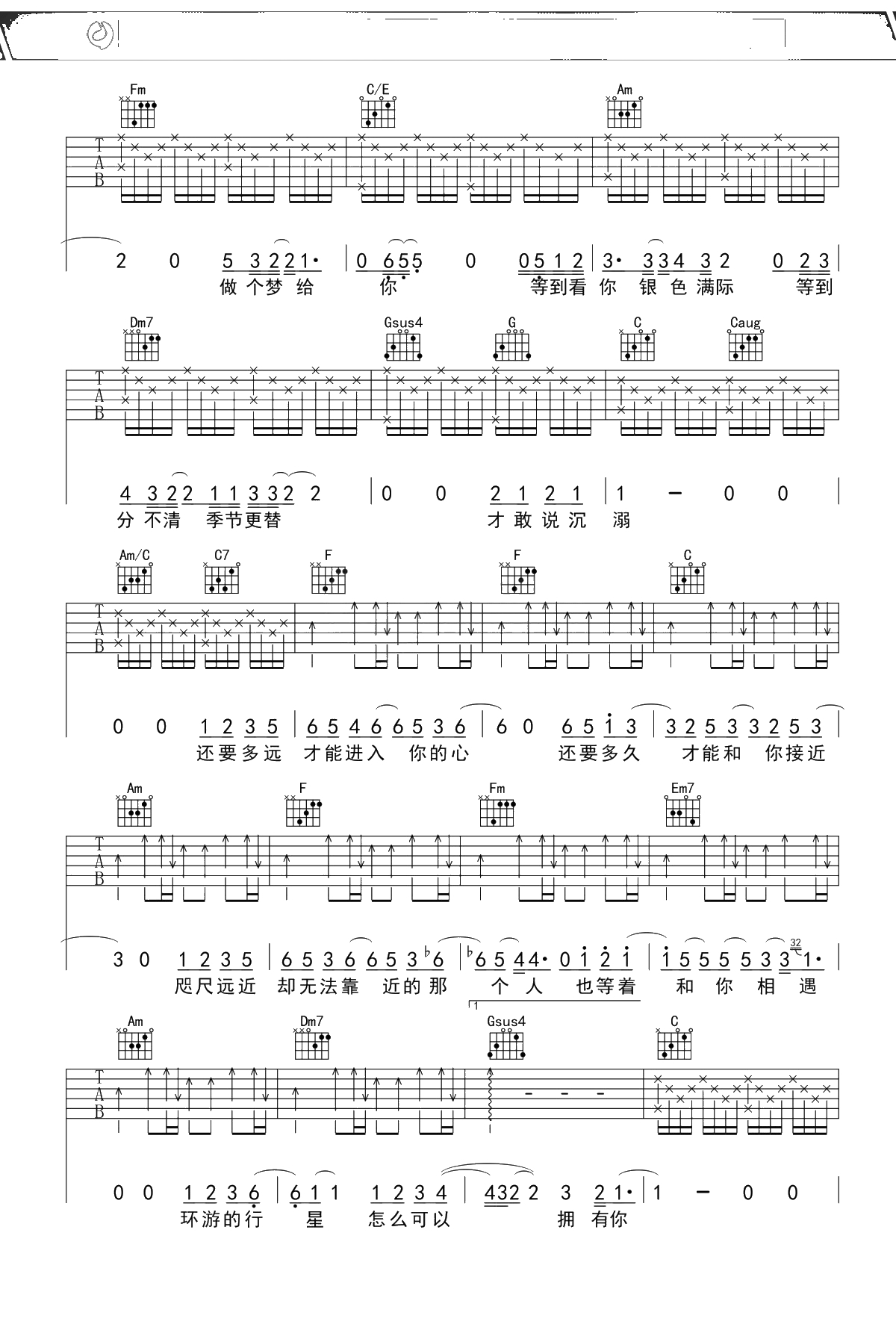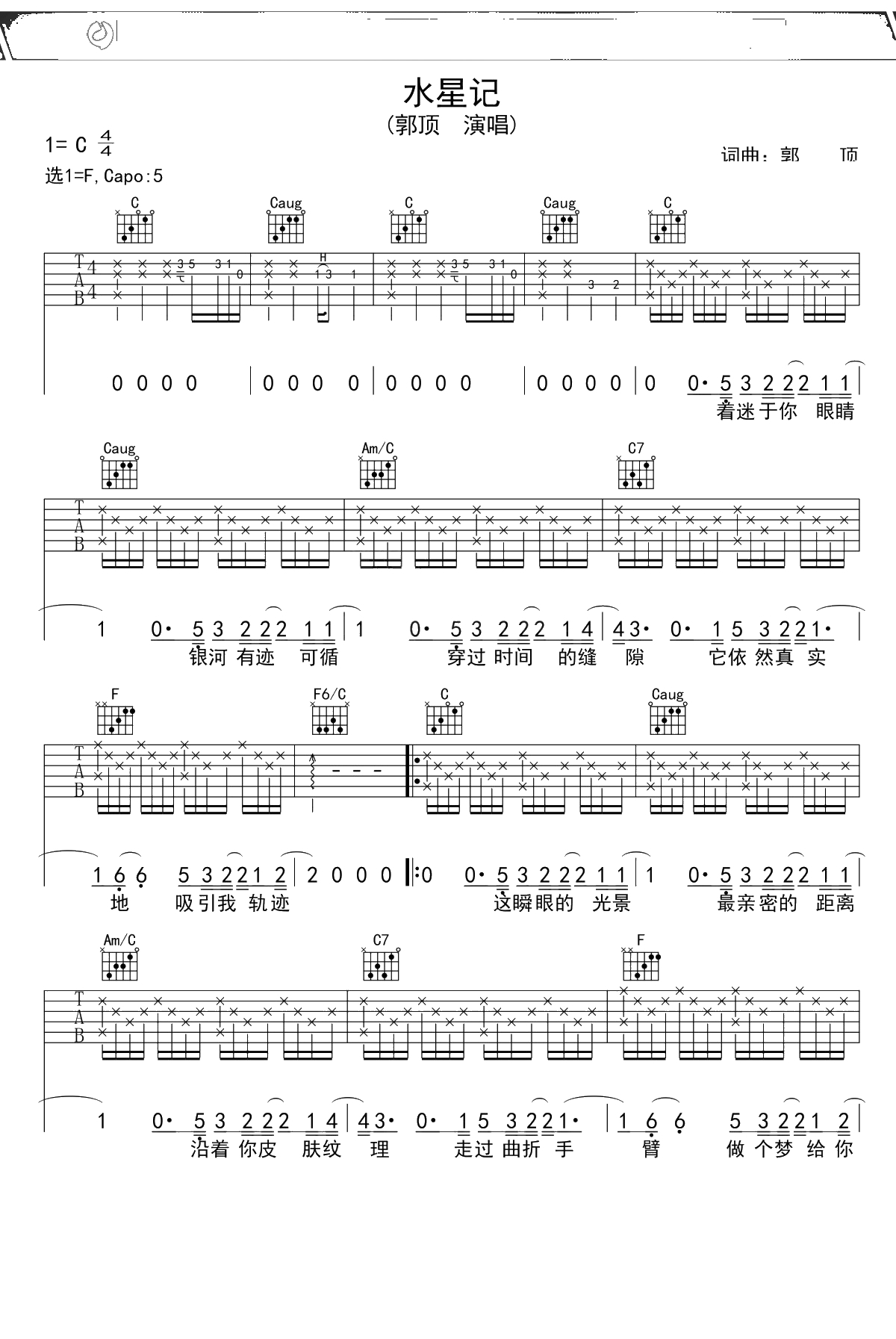 郭顶《水星记》C调吉他谱 弹唱六线谱吉他谱