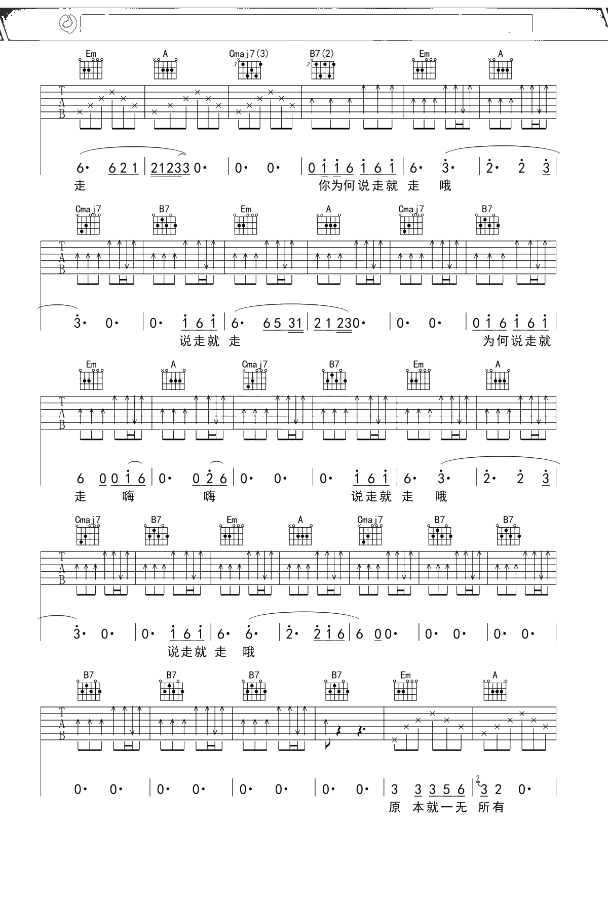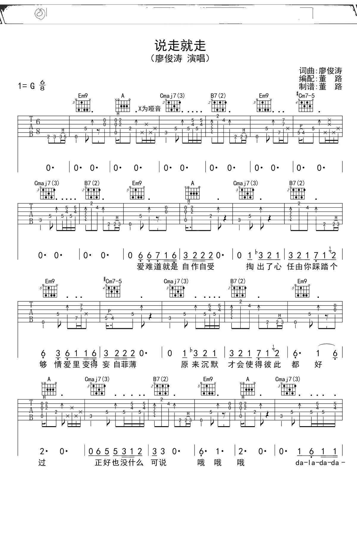 廖俊涛《说走就走》吉他谱 G调弹唱六线谱