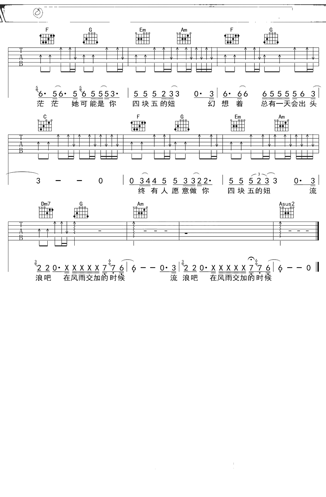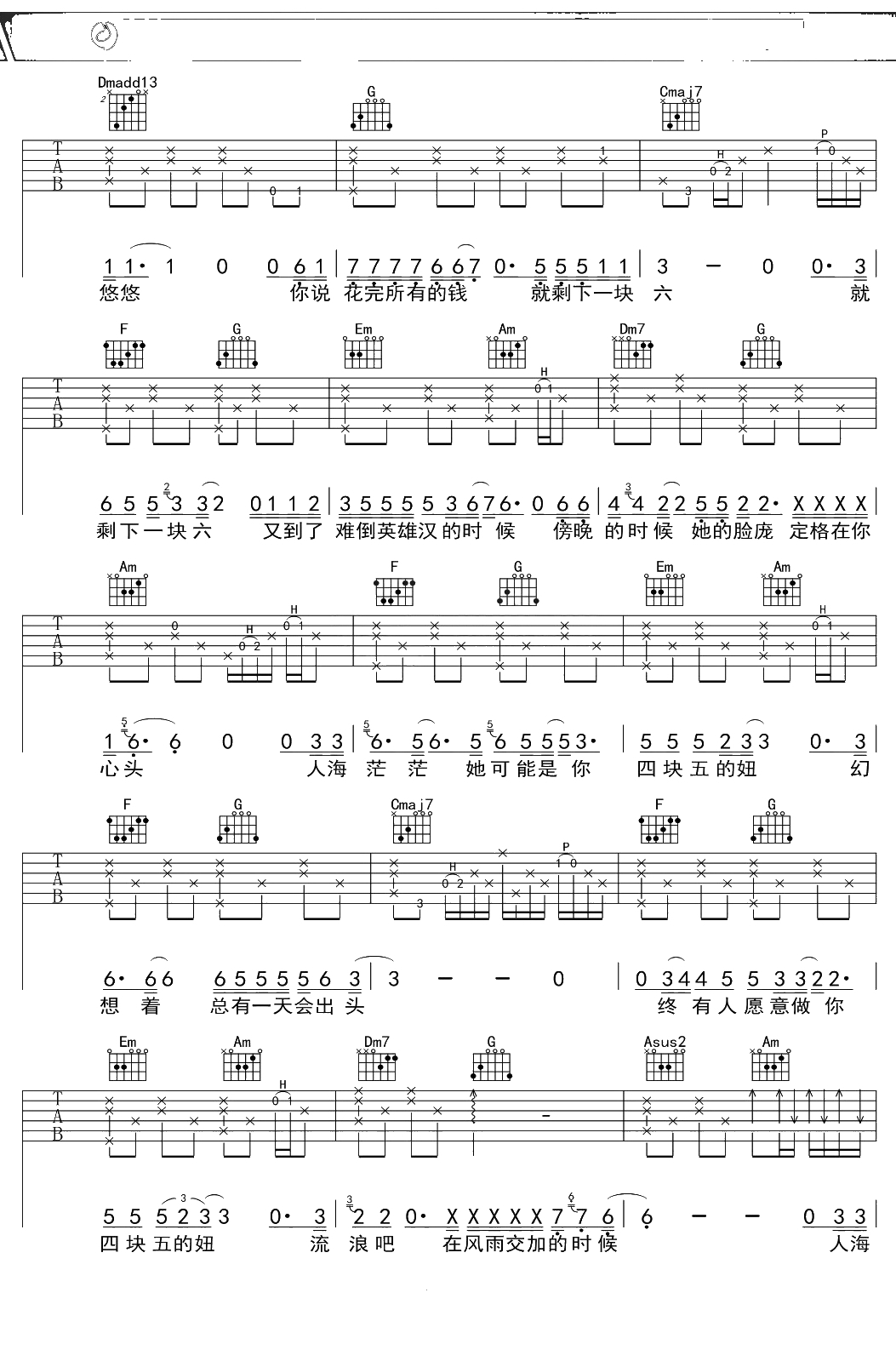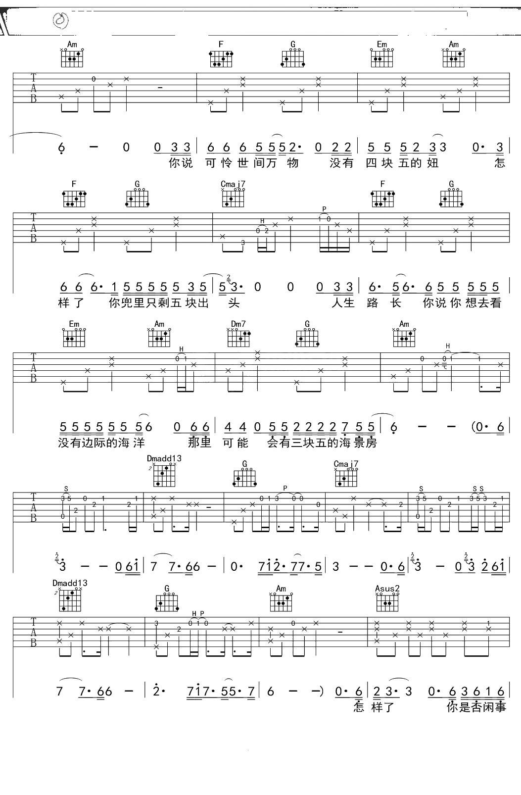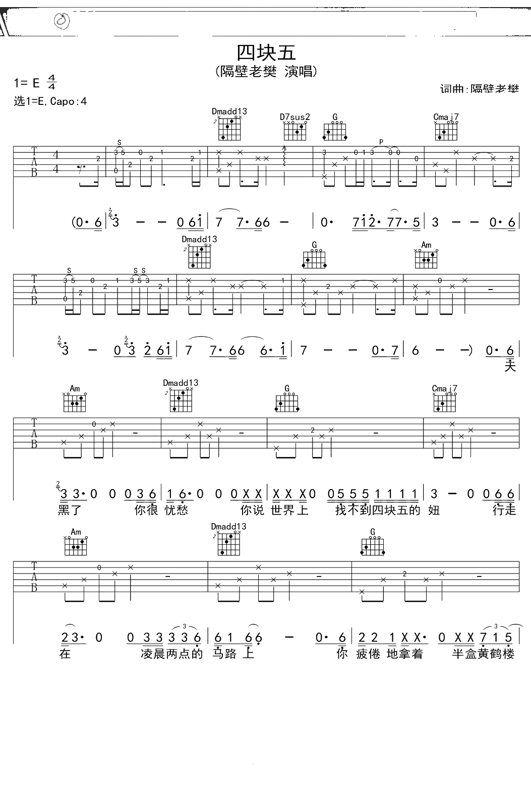 隔壁老樊《四块五的妞》吉他谱 E调弹唱六线谱