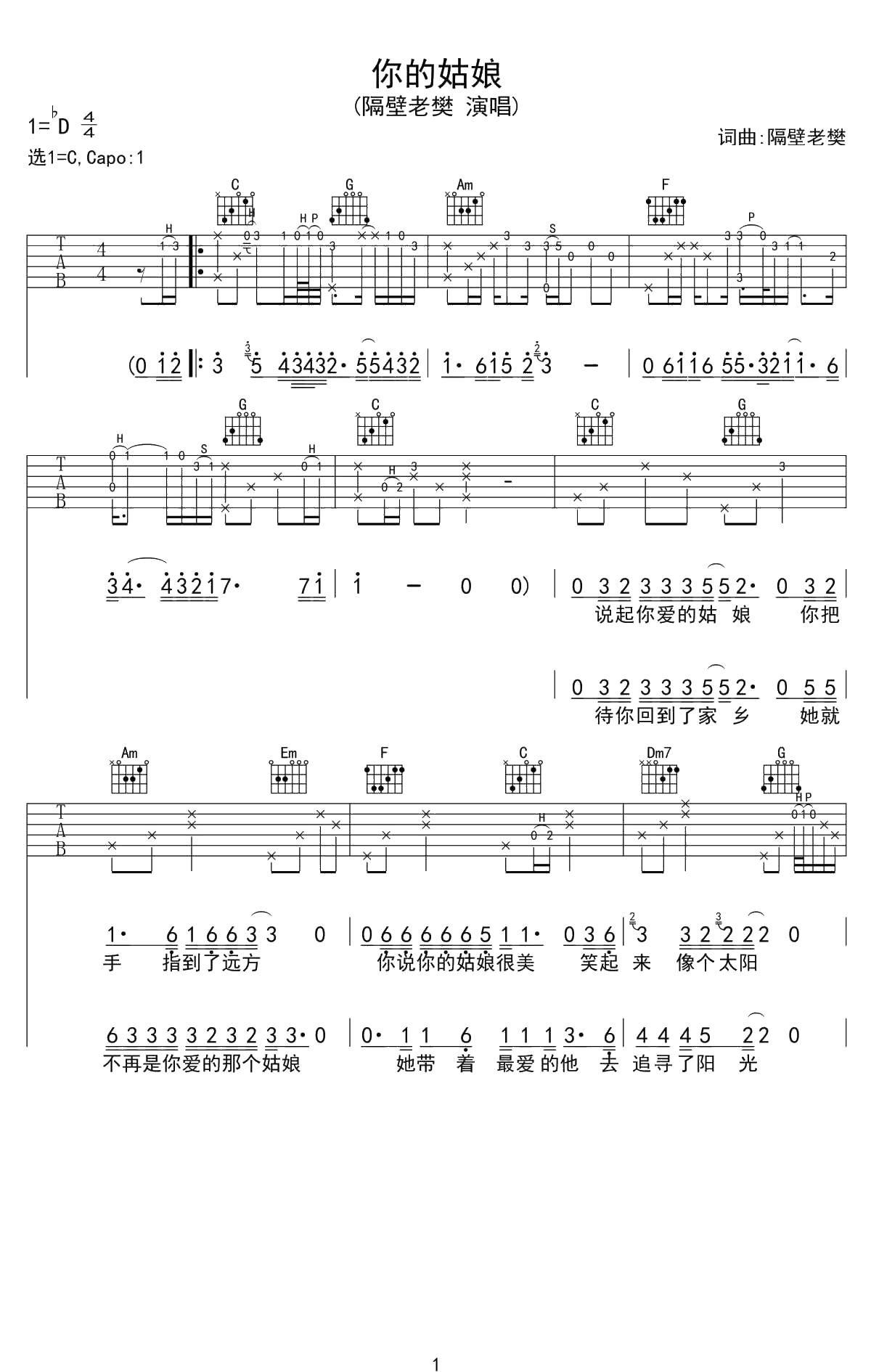 隔壁老樊《你的姑娘》吉他谱 C调弹唱六线谱