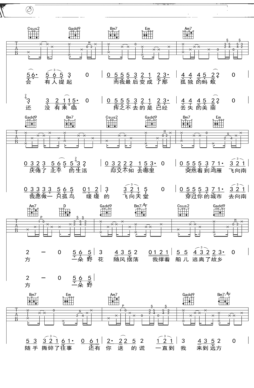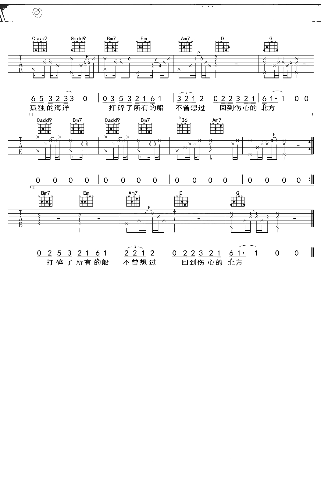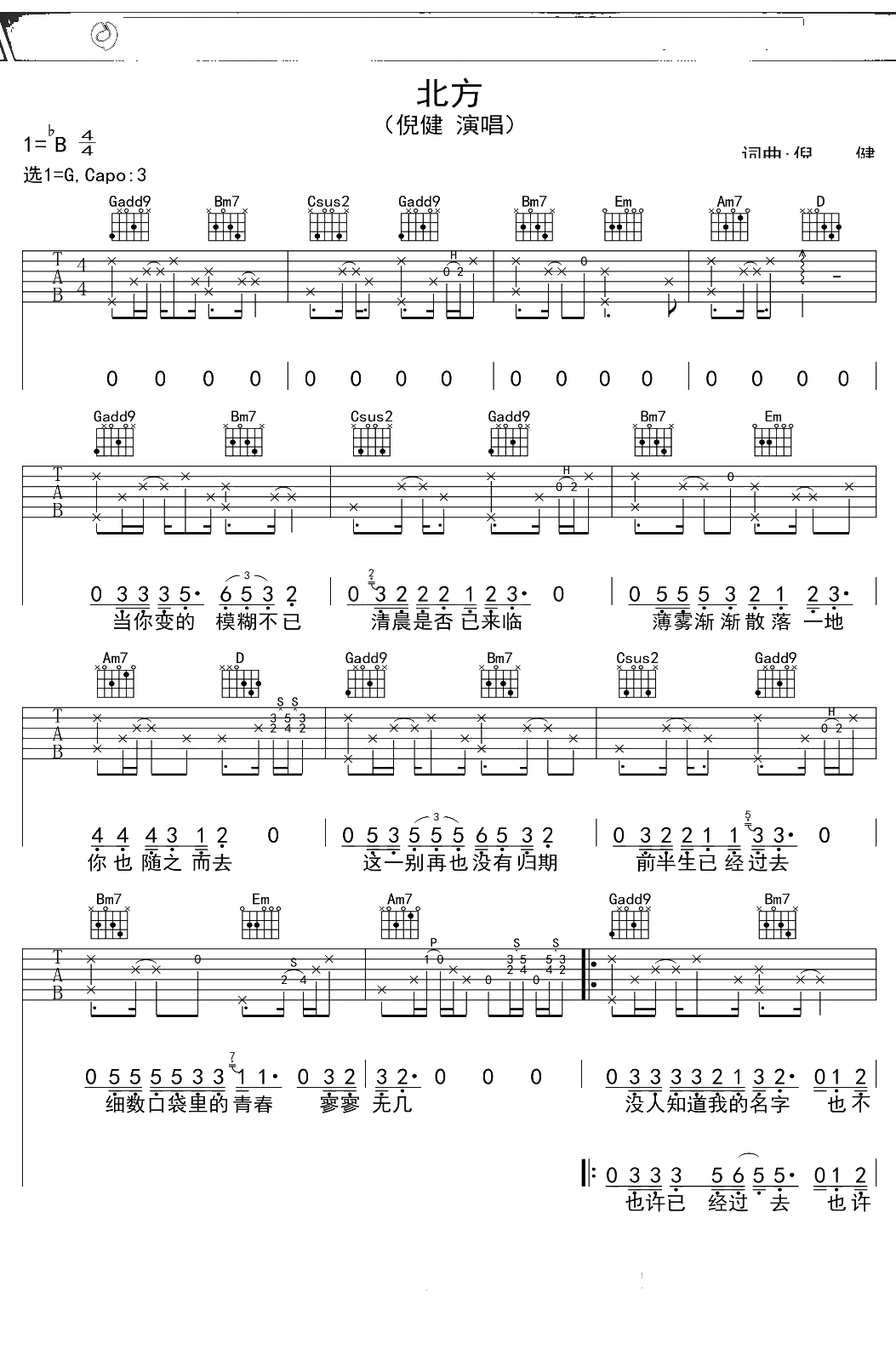 倪健《北方》吉他谱 G调弹唱六线谱