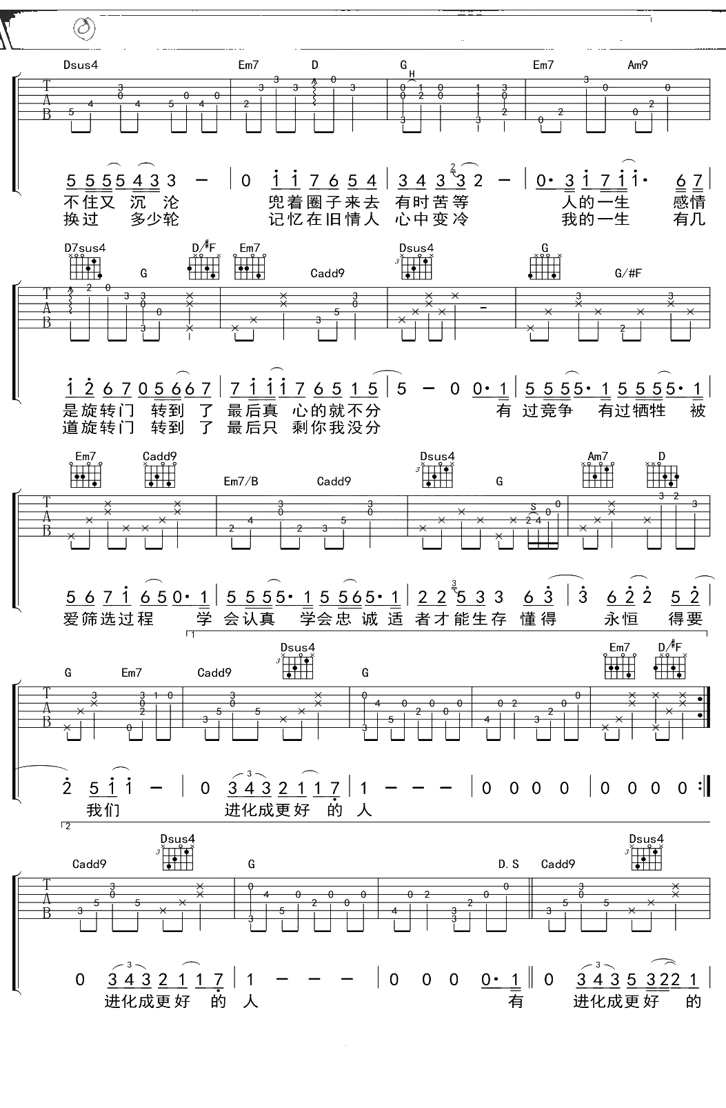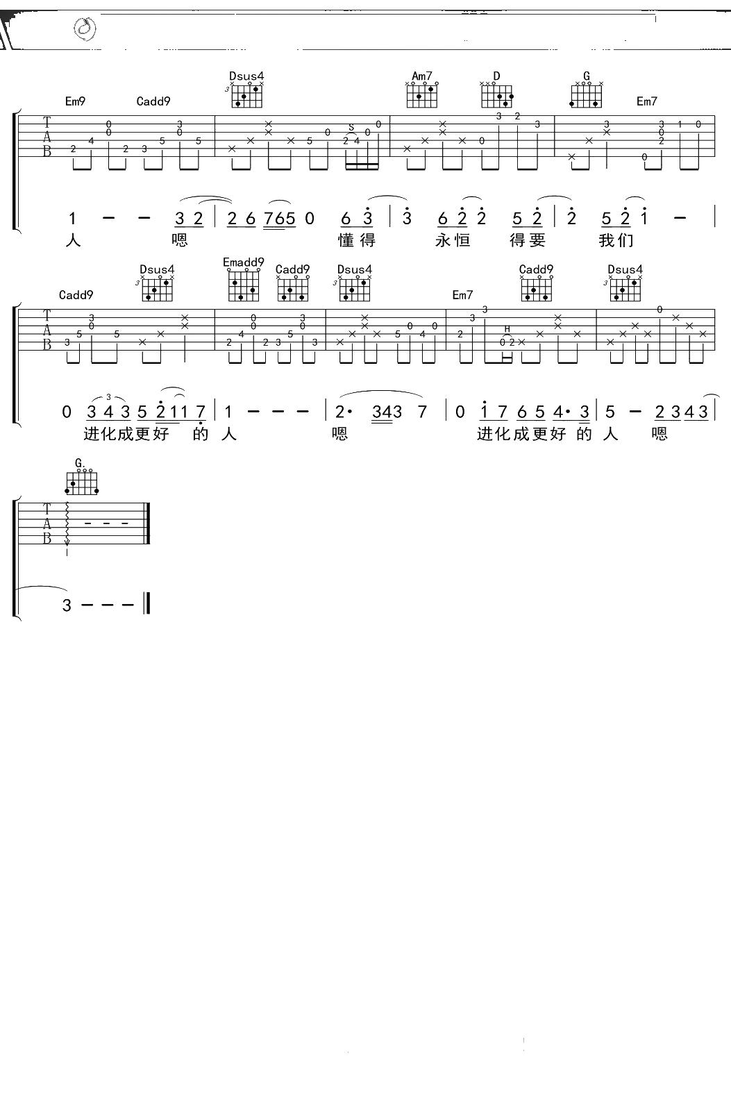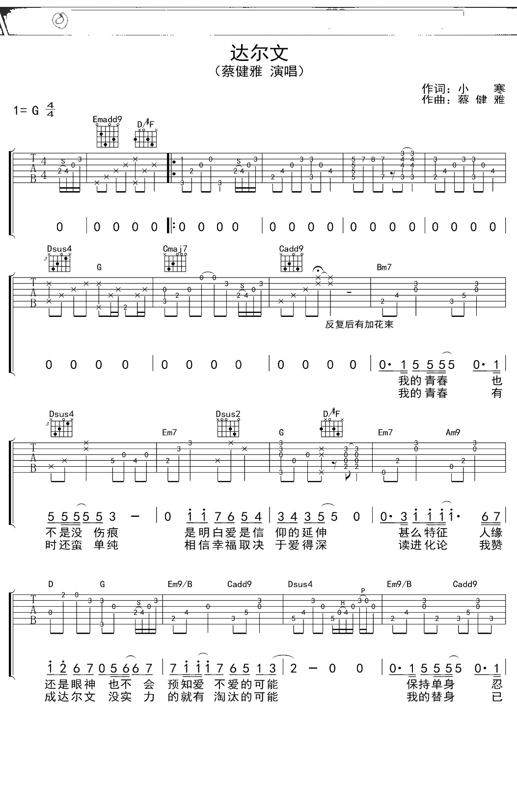 蔡健雅《达尔文》吉他谱 G调弹唱六线谱