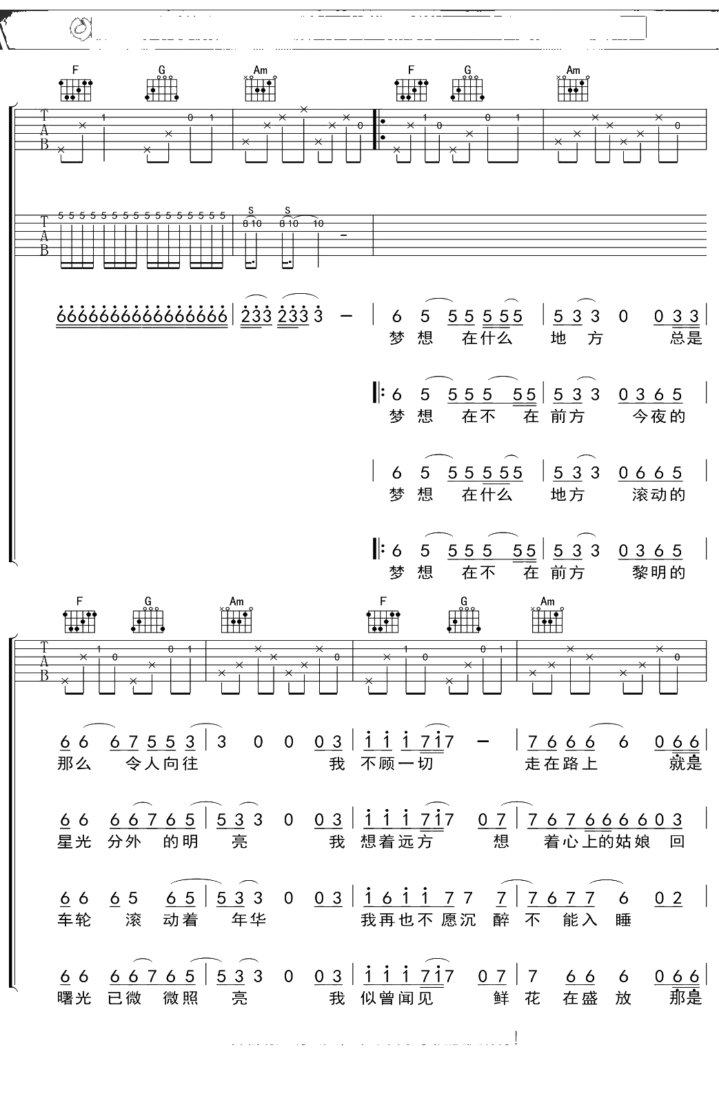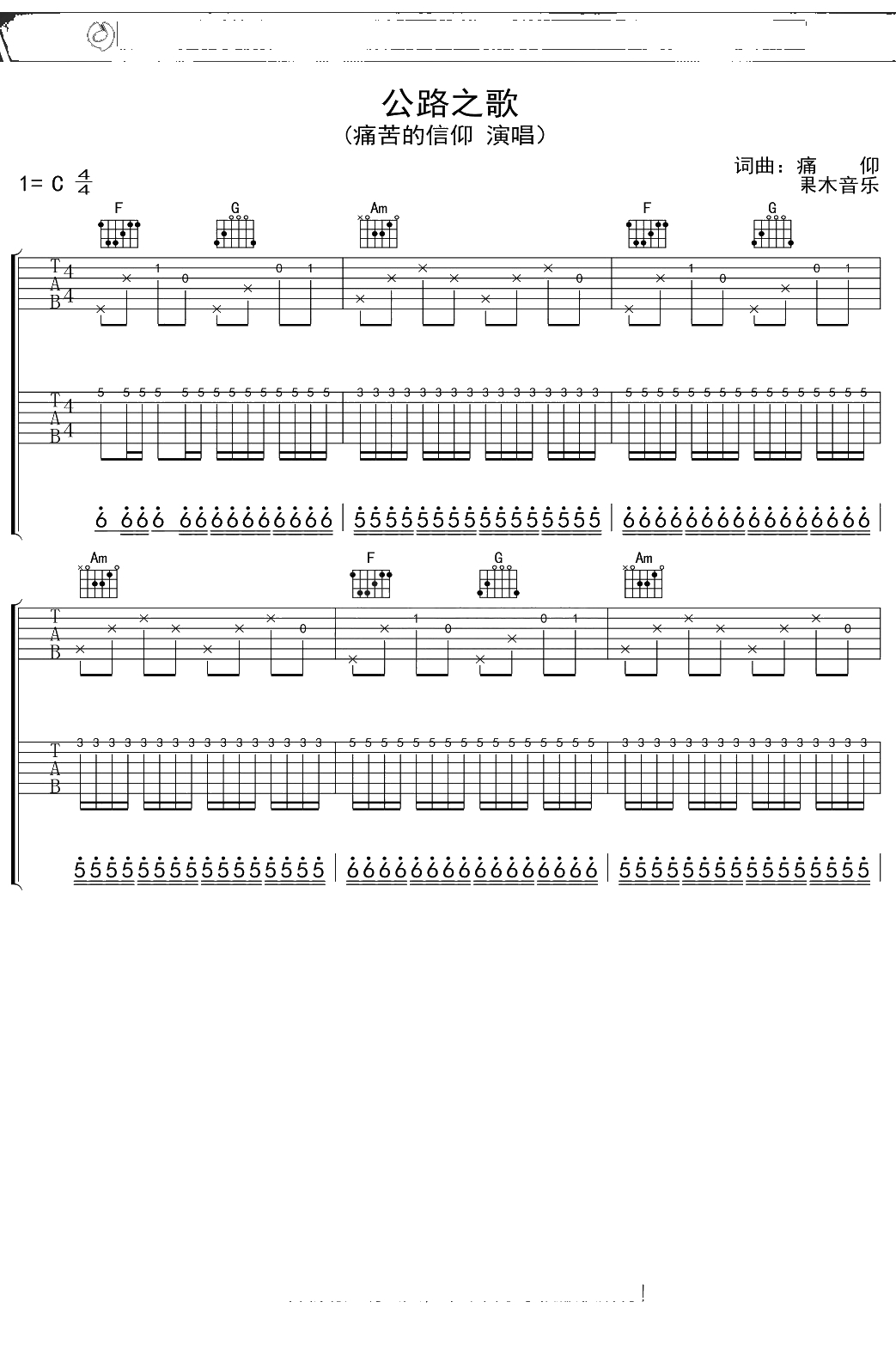 痛苦的信仰《公路之歌》吉他谱 C调弹唱六线谱