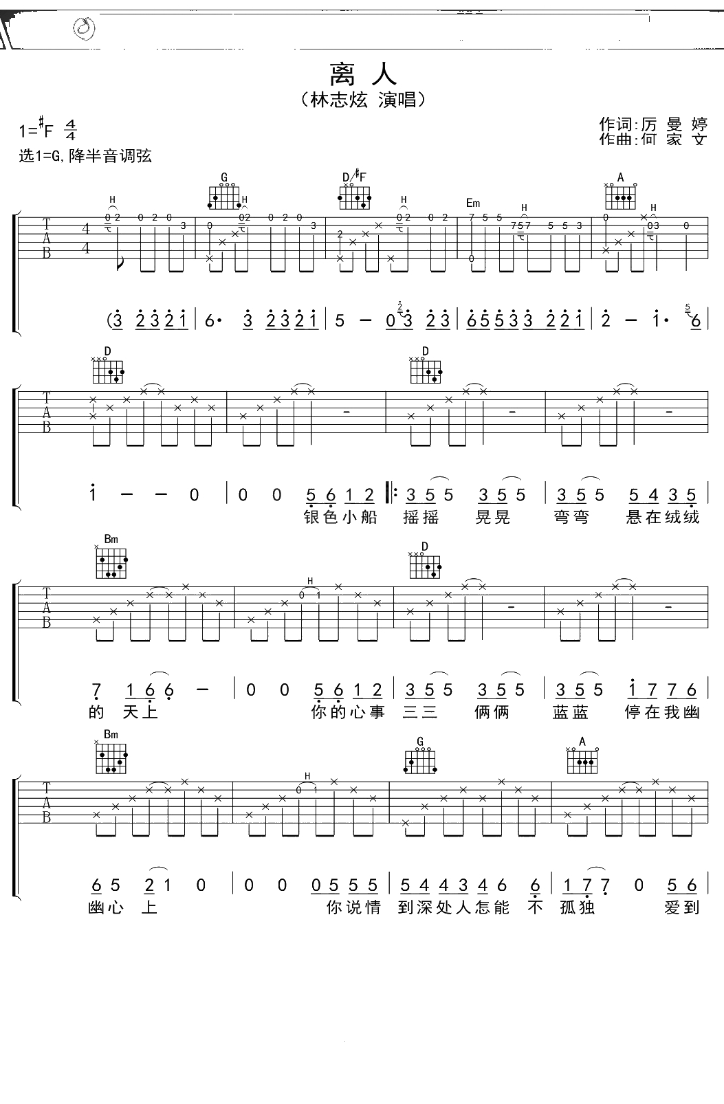 林志炫《离人》吉他谱 G调弹唱六线谱