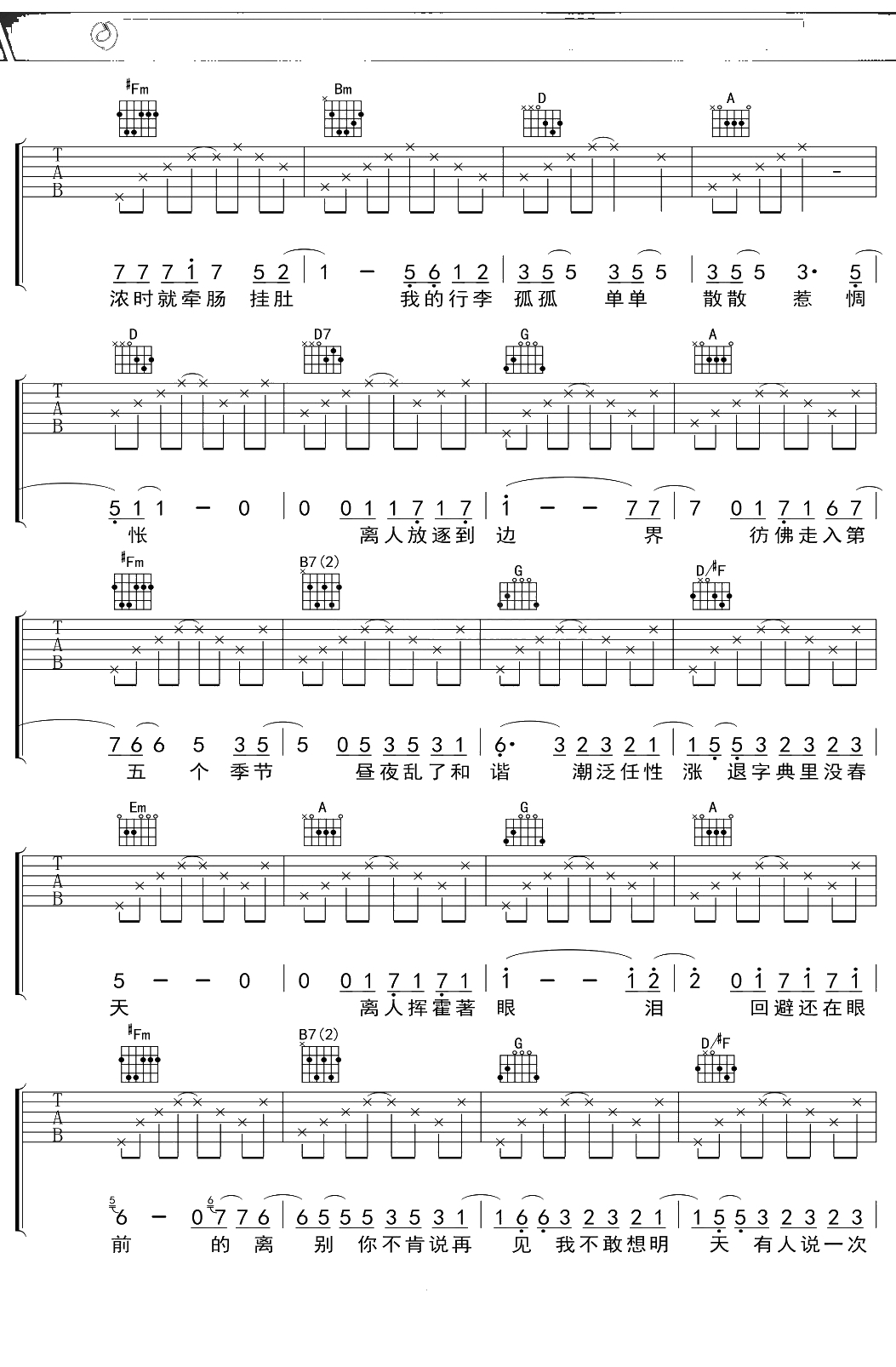 林志炫《离人》吉他谱 G调弹唱六线谱吉他谱