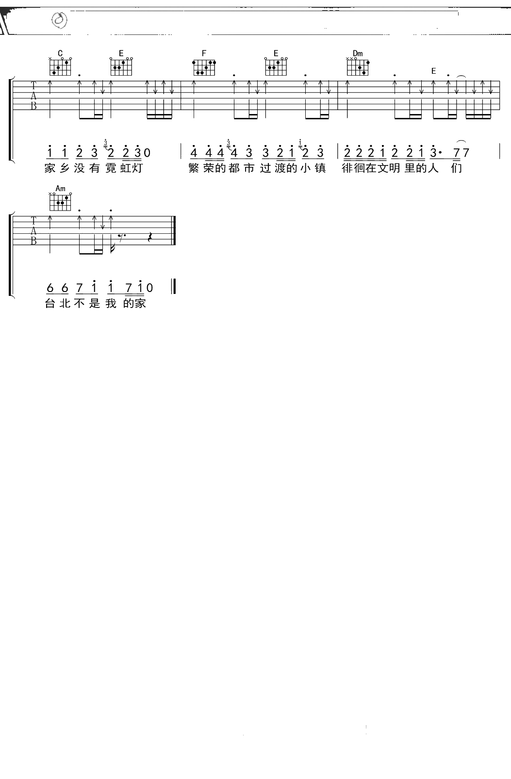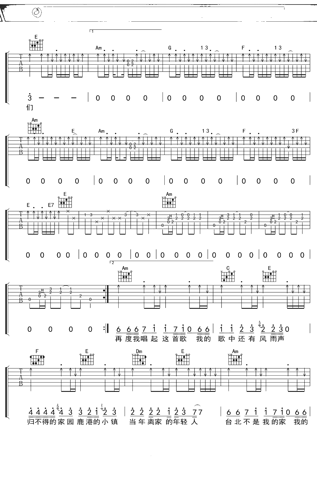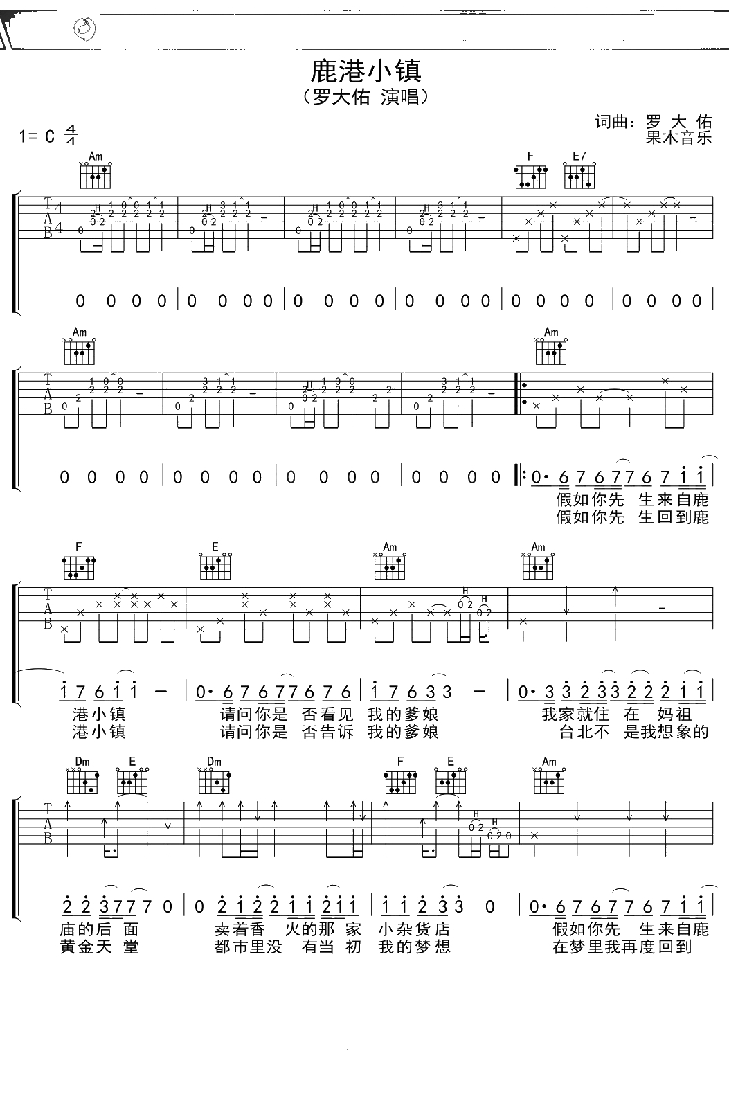 罗大佑《鹿港小镇》吉他谱 C调弹唱六线谱