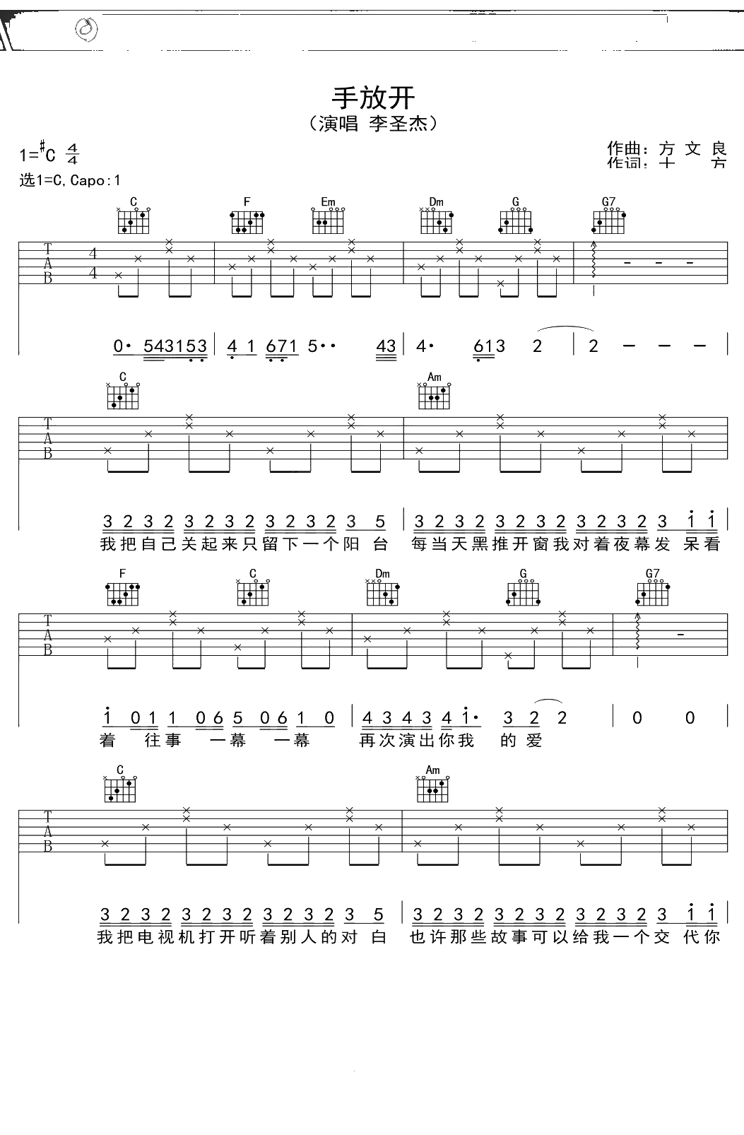 李圣杰《手放开》吉他谱 G调弹唱六线谱吉他谱