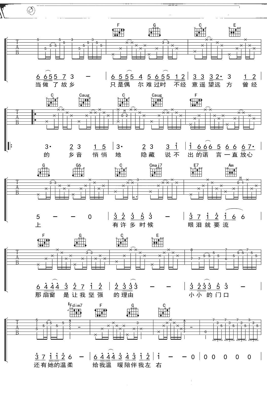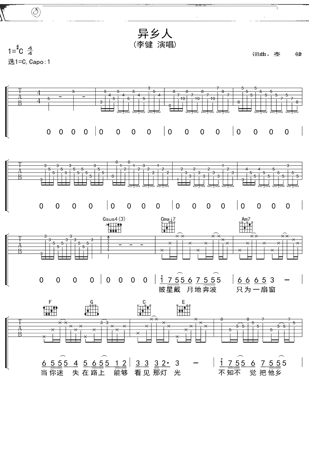 李健《异乡人》吉他谱 C调弹唱六线谱