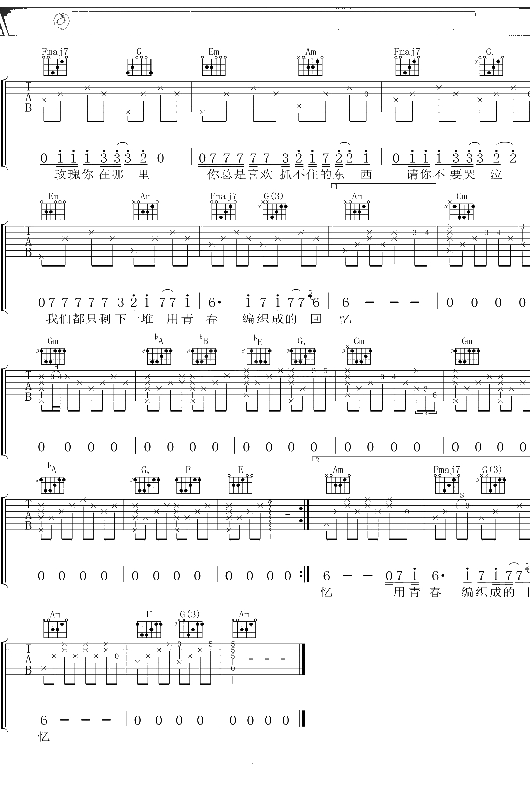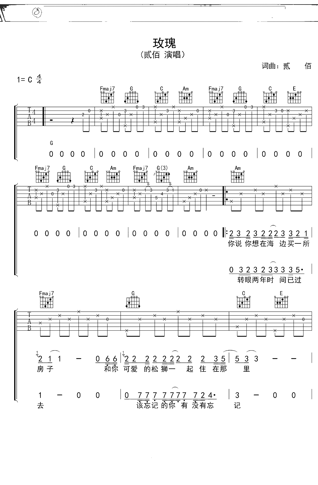 贰佰《玫瑰》吉他谱 C调弹唱六线谱