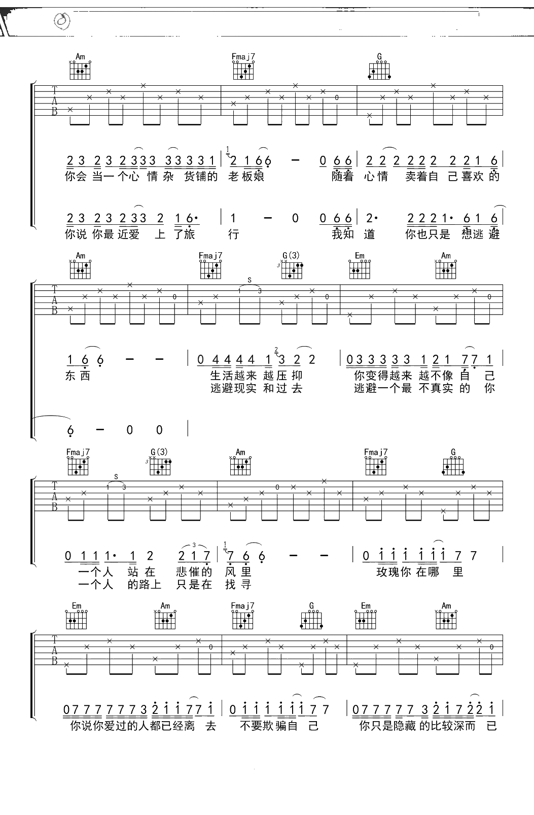 贰佰《玫瑰》吉他谱 C调弹唱六线谱吉他谱